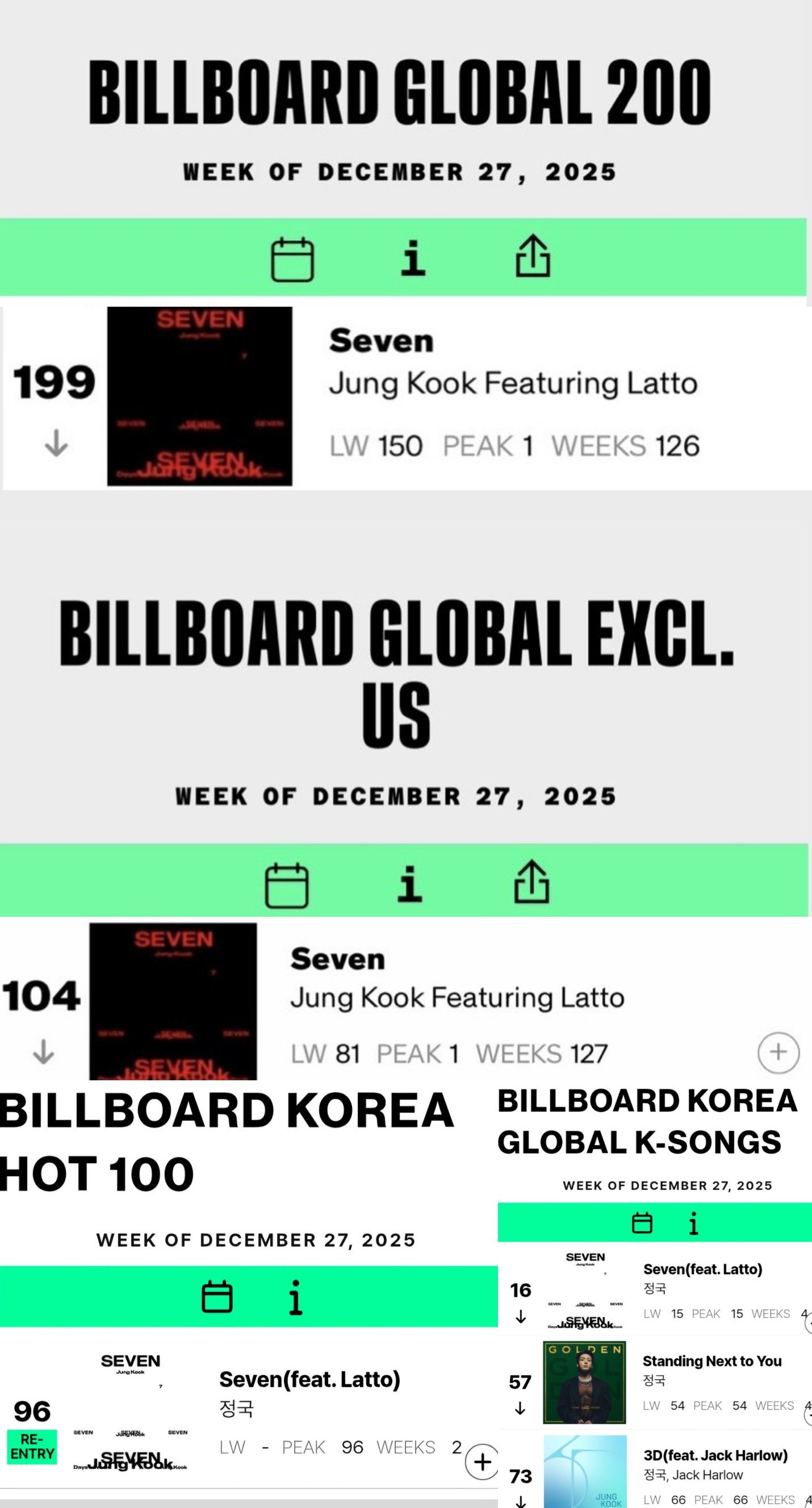 같은 날 ‘글로벌(미국 제외)’ 차트에서도 ‘Seven’은 104위를 기록했다. 크리스마스 캐럴이 차트를 장악한 시기에도 두 개의 글로벌 핵심 차트에 동시에 이름을 올린 것이다. 이 차트에서는 아시아 솔로 가수 최초이자 최장 기록인 127주 연속 진입을 이어가며 기록 행진을 멈추지 않았다.