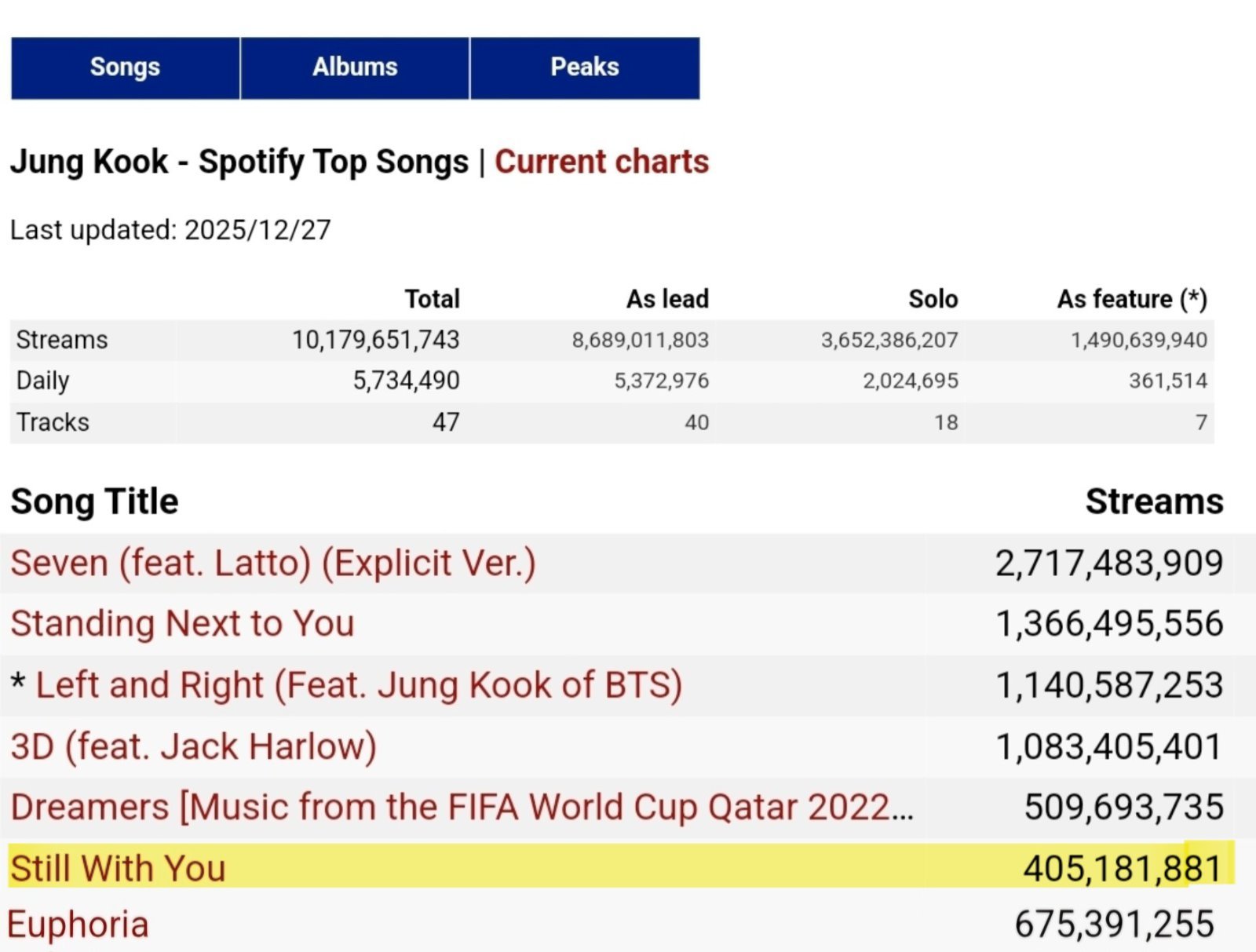 방탄소년단(BTS) 정국의 자작곡 ‘Still With You’가 세계 최대 음원 스트리밍 플랫폼 스포티파이에서 4억 스트리밍을 넘어섰다. 2020년 공개된 이 곡은 한국어로 된 팬송임에도 하루 평균 50만 안팎의 스트리밍을 유지하며 꾸준히 재생 수를 쌓아왔다.