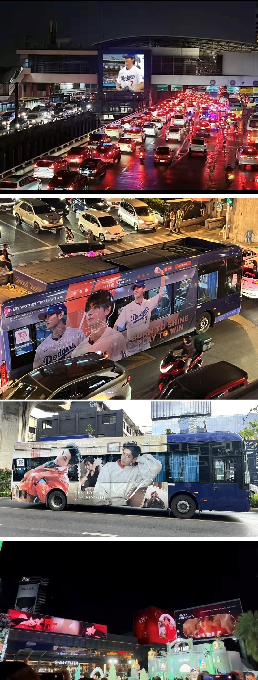 태국에서는 팬베이스 ‘BTSV_TH’가 방콕 시내를 달리는 래핑버스 2대를 한 달간 운행하며 생일 광고를 진행 중이다. 방콕의 랜드마크 시암파라곤에서는 2023년부터 3년 연속 대형 광고가 이어졌고, 교통 요충지 인터체인지 21의 대형 광고판에서도 3년 연속 축하 영상이 송출되고 있다.
