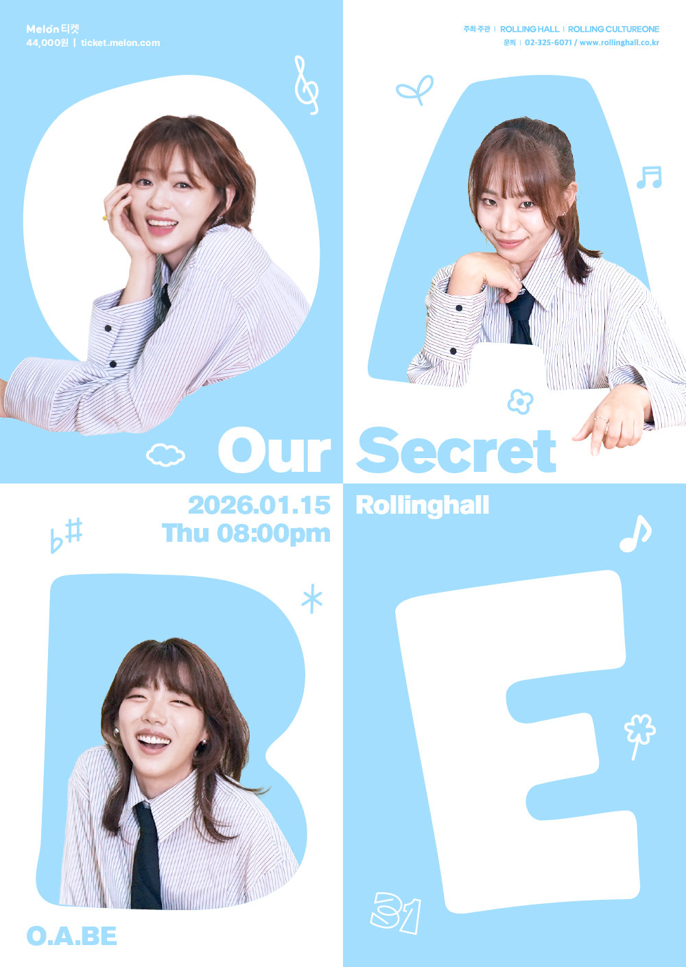 이번 공연은 오아베의 새로운 챕터를 여는 무대로, 그간의 음악 여정을 되짚는 동시에 앞으로 펼쳐질 변화와 성장을 예고하는 특별한 무대가 될 예정이다. ‘Our Secret’은 팬들과의 깊은 교감을 중심에 둔 콘서트로, 오아베만의 음악적 세계관과 스토리를 보다 밀도 있게 풀어낼 계획이다. 기존 곡은 물론 새로운 시도와 편곡을 통해 한층 성숙해진 오아베의 모습을 만날 수 있을 것으로 기대를 모은다.
