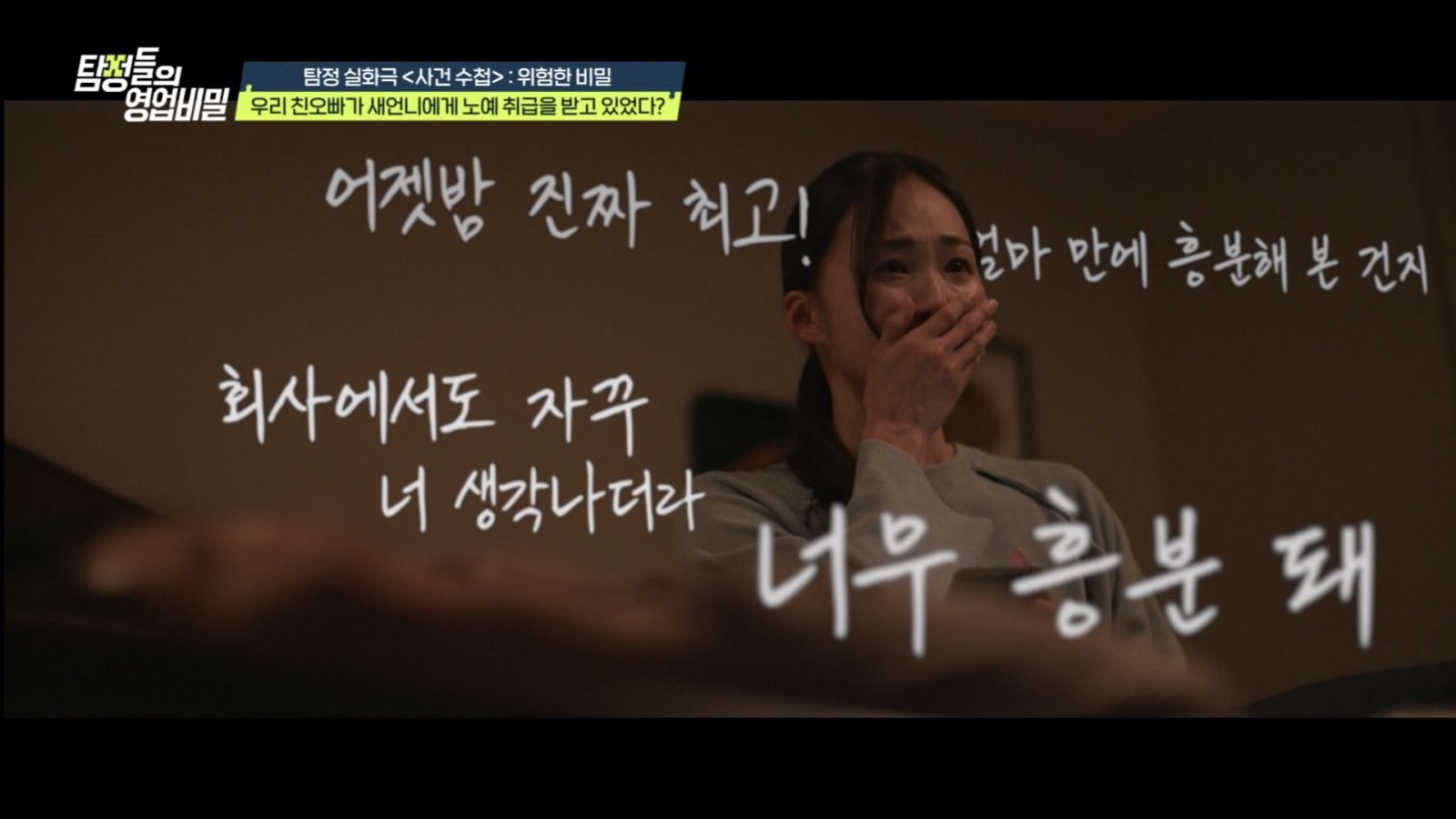 이어진 ‘사건 수첩’ 코너에서는 “결혼 10년 차인 친오빠가 바람을 피우는 것 같다”는 동생이 등장했다. 의뢰인은 “오빠가 주말마다 조카를 본가에 맡겨두고 나가서 밤늦게 들어온다. 누군가와 야릇한 영상통화를 하는 것도 봤다”며 불안을 호소했다.