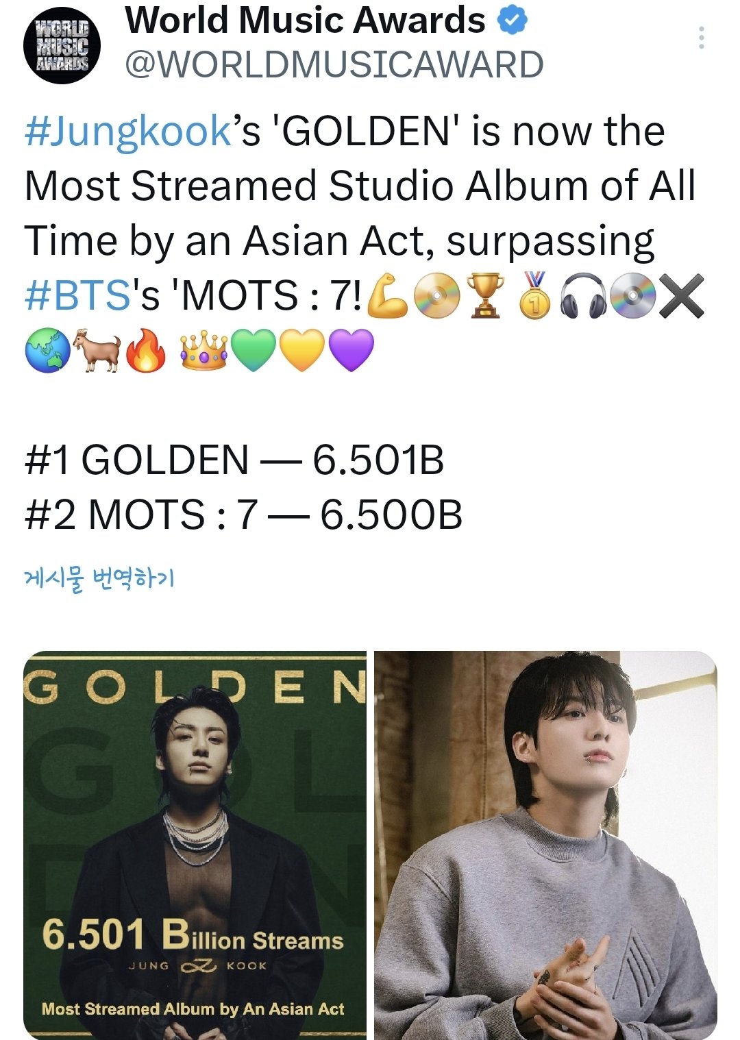 유럽에서 ‘빌보드’에 비견되는 월드뮤직어워드(WMA)에 따르면 ‘GOLDEN’은 역대 아시아 그룹과 가수를 통틀어 정규 앨범 기준 최다 스트리밍 기록을 세웠다. 스트리밍 수치뿐 아니라 차트 성적도 눈에 띈다. ‘GOLDEN’은 스포티파이 ‘위클리 톱 앨범 글로벌’ 차트에 112주 연속 이름을 올리며 아시아 솔로 가수 음반 최초이자 최장 기록을 동시에 경신했다.