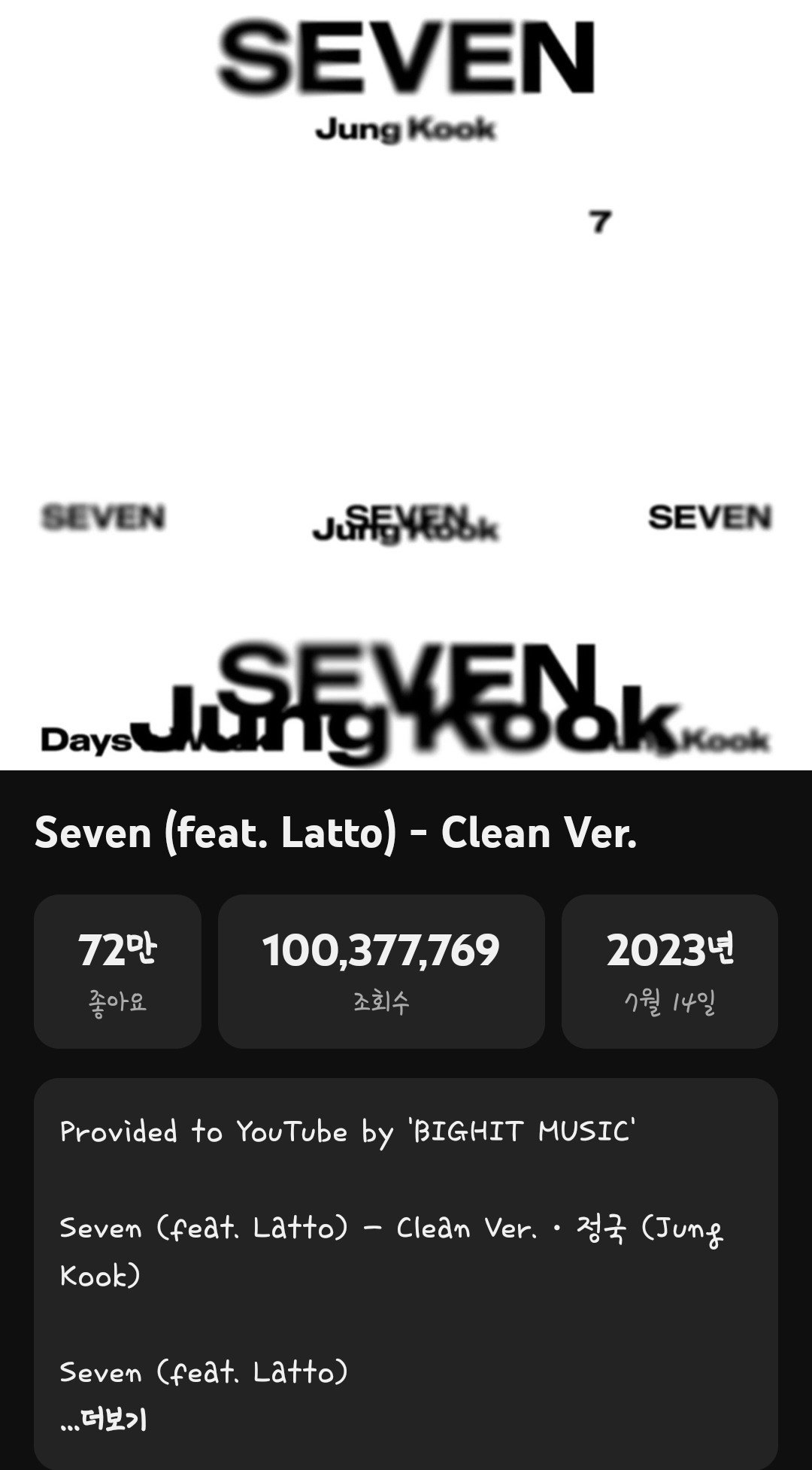 [스포츠동아 | 양형모 기자] 방탄소년단(BTS) 정국이 유튜브 오디오 영상으로 또 하나의 전례 없는 이정표를 세웠다. 정국의 솔로 싱글 ‘Seven’ 클린 버전 오디오 영상이 유튜브 조회수 1억을 돌파하며, 유튜브 오디오 영상 기준 통산 6번째 1억 뷰 고지를 밟았다.