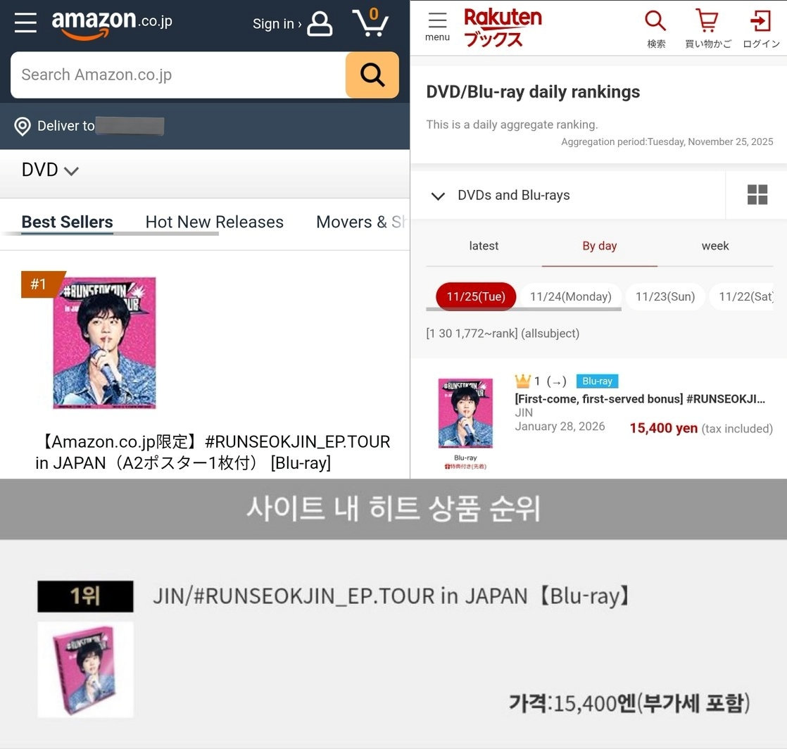 방탄소년단(BTS) 진의 첫 월드 투어를 담은 블루레이 ‘#RUNSEOKJIN_epTOUR in Japan’이 일본 주요 유통 채널에서 베스트셀러 1위를 차지했다. 해당 블루레이는 판매 개시 직후 아마존 재팬과 라쿠텐 DVD·Blu-ray 부문에서 나란히 1위에 올랐고, 유니버셜 뮤직 재팬 스토어에서도 히트 상품 1위를 기록하며 뜨거운 반응을 얻었다.