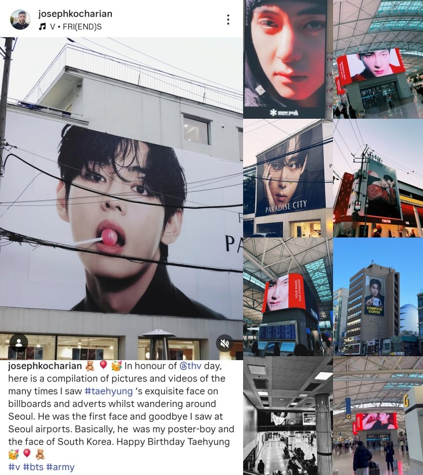 조셉 코차리안은 롤링스톤 UK, 영국 라이프스타일 매거진 헝거(HUNGER Magazine) 등에서 활동해온 인물이다. 그는 게시글을 통해 “태형이의 생일을 기념해 서울 곳곳을 돌아다니며 광고판과 광고에서 봤던 태형이의 얼굴을 모아봤다”며 “공항에서 가장 먼저 인사를 건넨 얼굴이었고, 나에게는 ‘포스터보이’이자 대한민국을 대표하는 얼굴이었다”고 전했다. 이어 뷔에게 직접 생일 축하 인사를 남겼다.