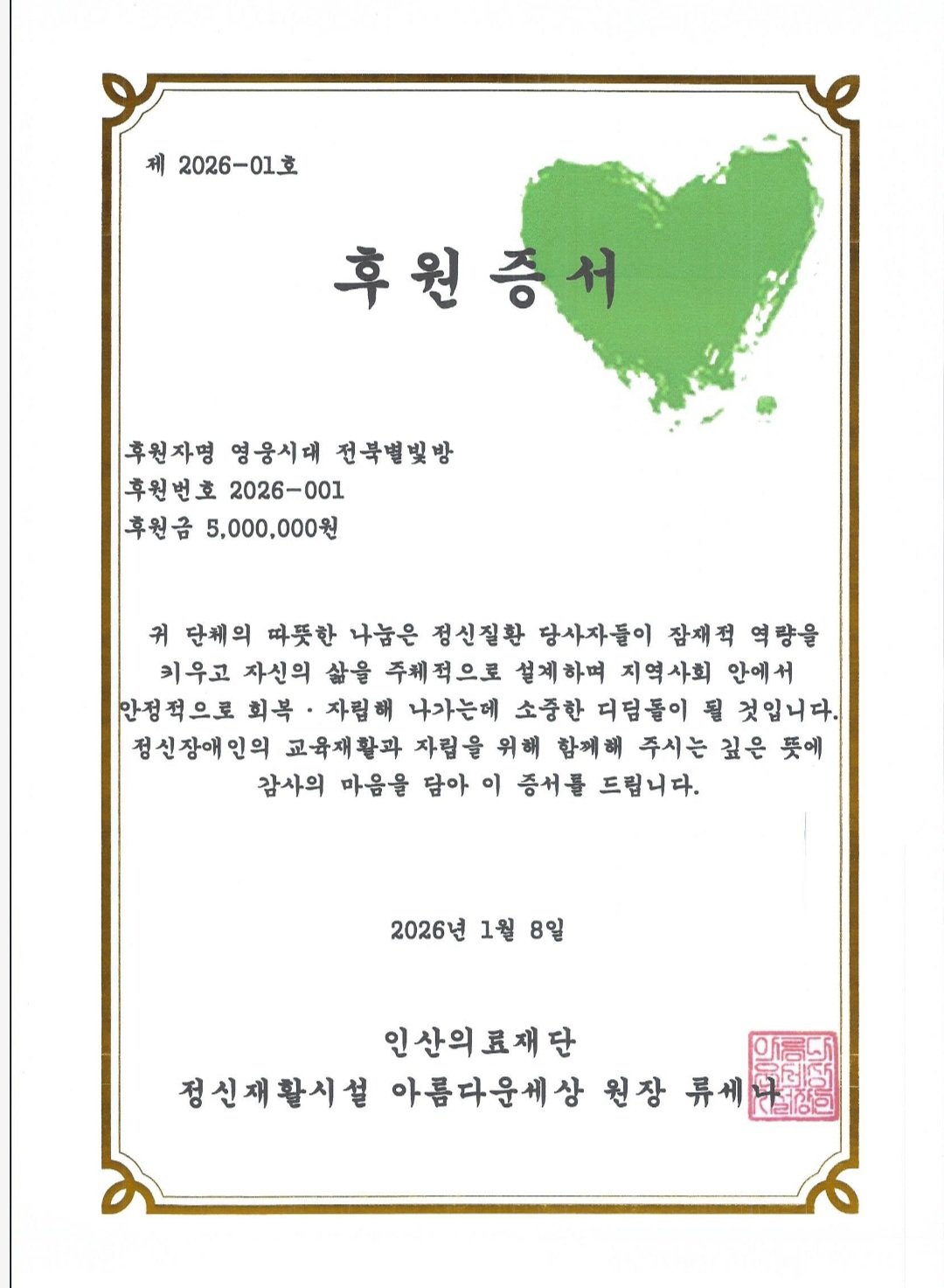 가수 임영웅 팬들의 모임인 영웅시대 전북별빛방은 1월 8일 인산의료재단 정신재활시설 ‘아름다운세상’에 500만 원을 후원했다. 이번 후원은 시설에 등록된 당사자들이 자신의 삶을 스스로 설계하고, 회복과 자립을 향해 나아가는 데 도움을 주기 위한 교육지원사업 응원 차원에서 마련됐다.