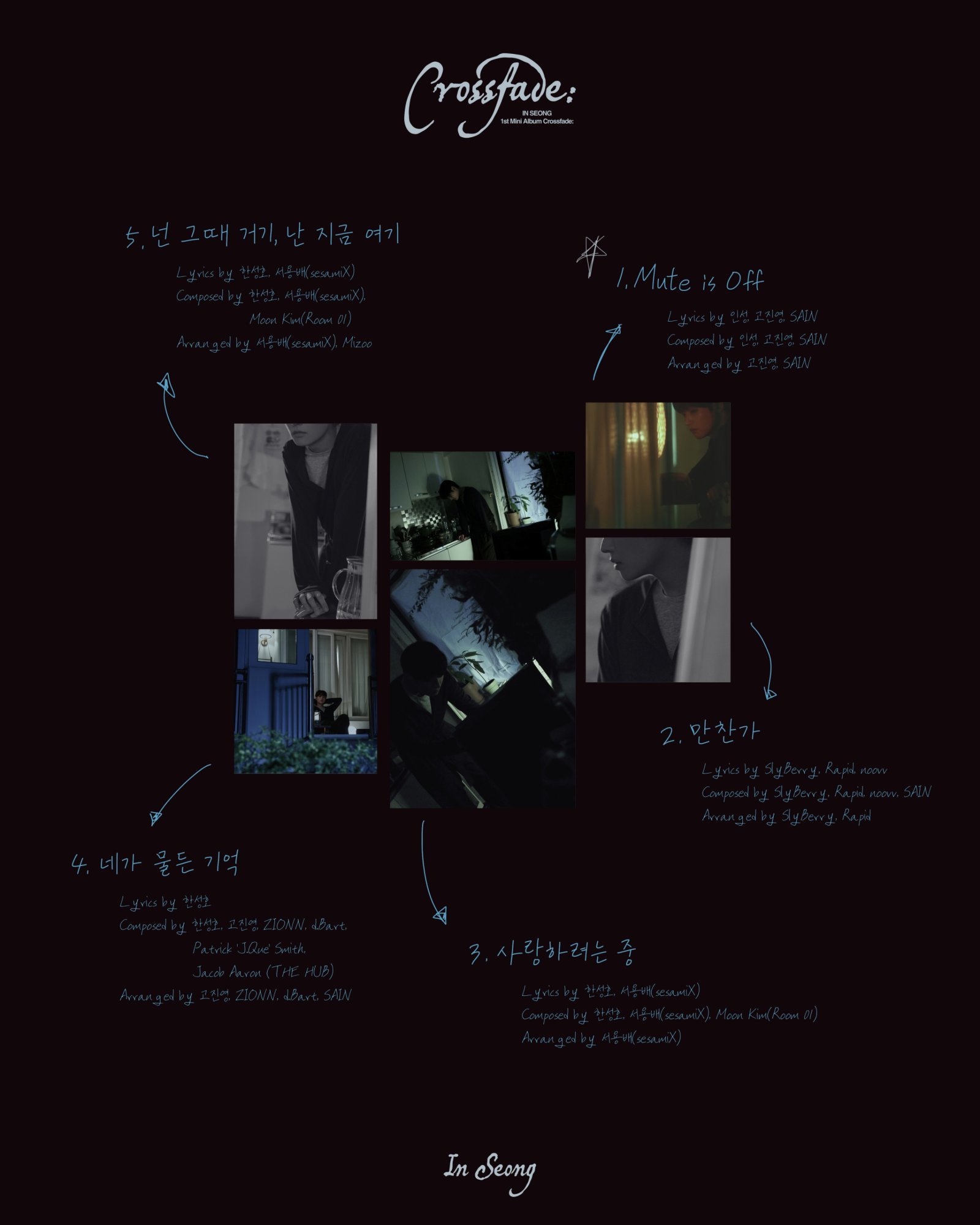 소속사 FNC엔터테인먼트는 9일 공식 SNS를 통해 인성의 미니 1집 ‘Crossfade:’(크로스페이드:) 트랙리스트가 포함된 타이틀 포스터를 공개했다. 포스터에는 혼자만의 공간에서 여러가지 감정을 느끼는 인성의 가장 솔직한 모습을 담았다.