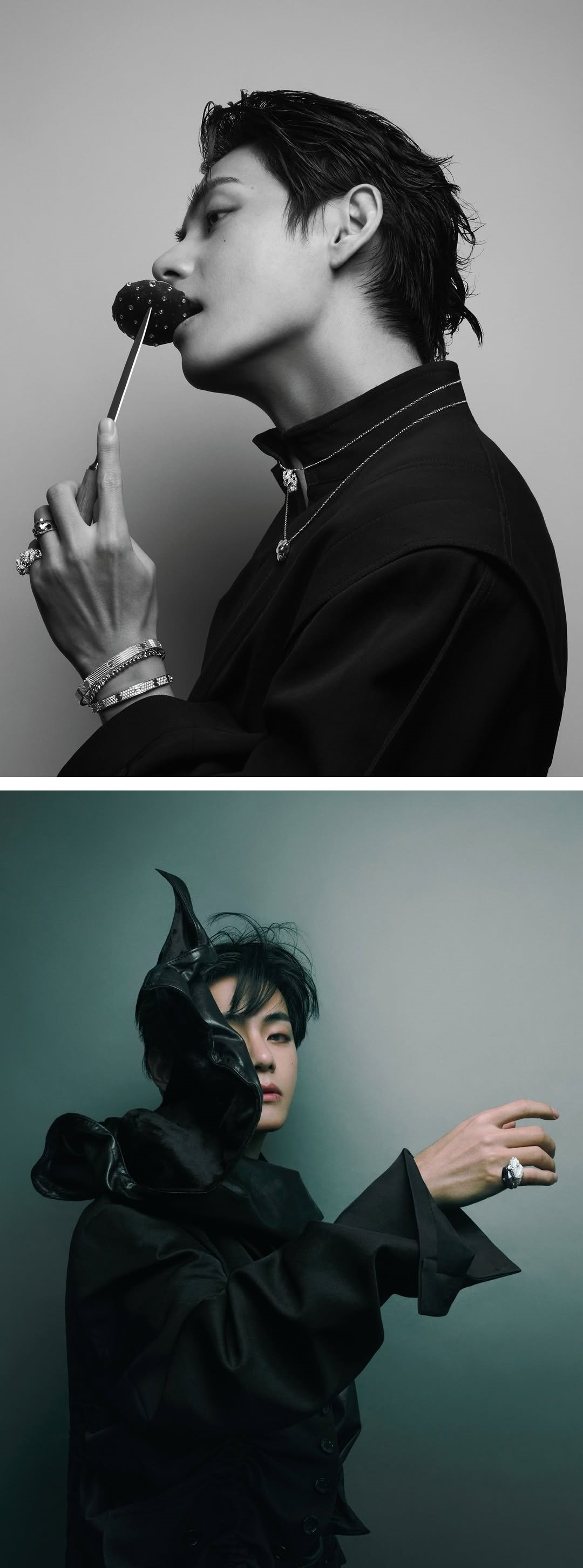 뷔는 화보마다 전혀 다른 얼굴을 보여주며 시선을 사로잡았다. 순수한 이미지와 강렬한 카리스마, 부드러움과 날카로움이 공존하는 분위기를 자유롭게 오가며 독보적인 존재감을 드러냈다. 촬영 내내 같은 표정이 반복되지 않았다는 평가도 이어졌다.