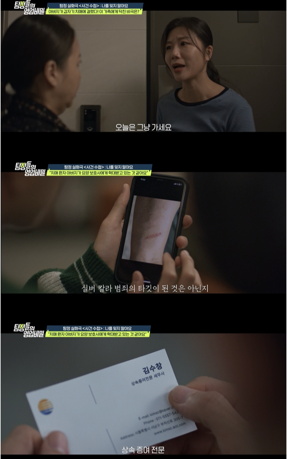 그러나 이후 의뢰인은 “아버지 몸에 알 수 없는 멍이 생기고, 최근 아버지 통장에서 현금이 인출되고 있다”며 요양 보호사의 소행을 의심했다고 한다. 탐정단은 요양 보호사가 의뢰인의 아버지를 데리고 외출하는 장면을 포착하고, 두 사람이 도착한 곳이 상속·증여 전문 세무사 사무실이라는 사실을 확인한다. 이후 탐문 과정에서 치매 환자 아버지를 둘러싼 수상한 정황과 가려져 있던 진실이 드러나며 스튜디오가 술렁인다.