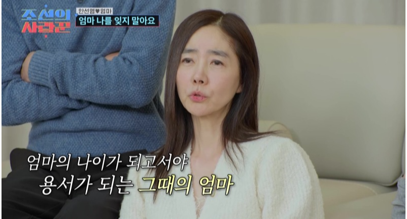어머니를 다시 요양원으로 보내며 이별을 마친 안선영은 “세상에서 제일 허비하는 시간이 누군가를 미워하는 시간이다. 50년을 허비했다. 엄마를 미워하느라…”라고 털어놨다. 이어 “너무 고마워, 엄마. 지금처럼 잘 먹고 잘 자고…건강만 해. 내가 다 해줄게”라고 기억이 희미해진 어머니에게 진심을 전하며 끝내 눈물을 쏟았다.