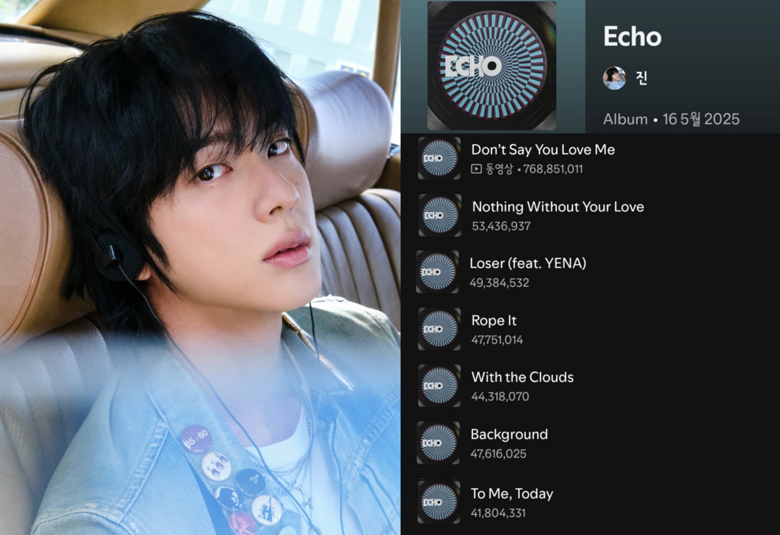 앨범 단위 성과도 눈에 띈다. ‘ECHO’는 누적 스트리밍 10억 회를 돌파하며 단일 곡을 넘어 솔로 아티스트 진의 음악적 경쟁력을 입증했다. 수록곡 ‘Nothing Without Your Love’는 5343만 회, ‘Loser’(feat. YENA)는 4938만 회 스트리밍을 기록하는 등 앨범 전반이 고른 청취 지표를 나타내고 있다. 진의 섬세한 표현력과 단단하면서도 부드러운 보컬이 글로벌 청취자들의 높은 집중도를 이끌어냈다는 평가다.