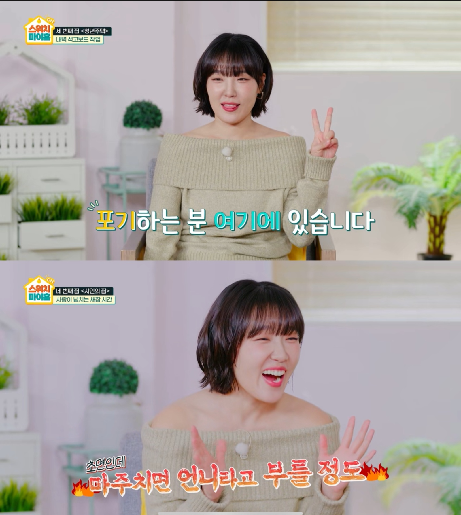 일정상 마지막 집 공사를 함께하지 못한 이은지는 윤두준과 영상 통화를 하며 추운 날씨에 작업 중인 멤버들을 챙겼다. 동료와는 영상 통화로 소개팅 상황극에 순식간에 몰입했고, 벽 시공에 나선 윤두준에게 “콘서트장에서 팬들 마음이나 부숴봤지”라고 말해 유쾌한 웃음을 터뜨렸다.