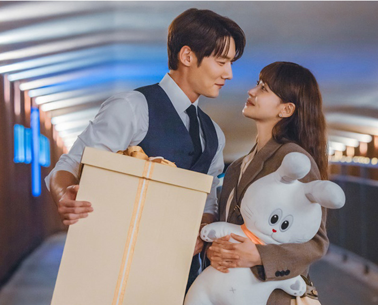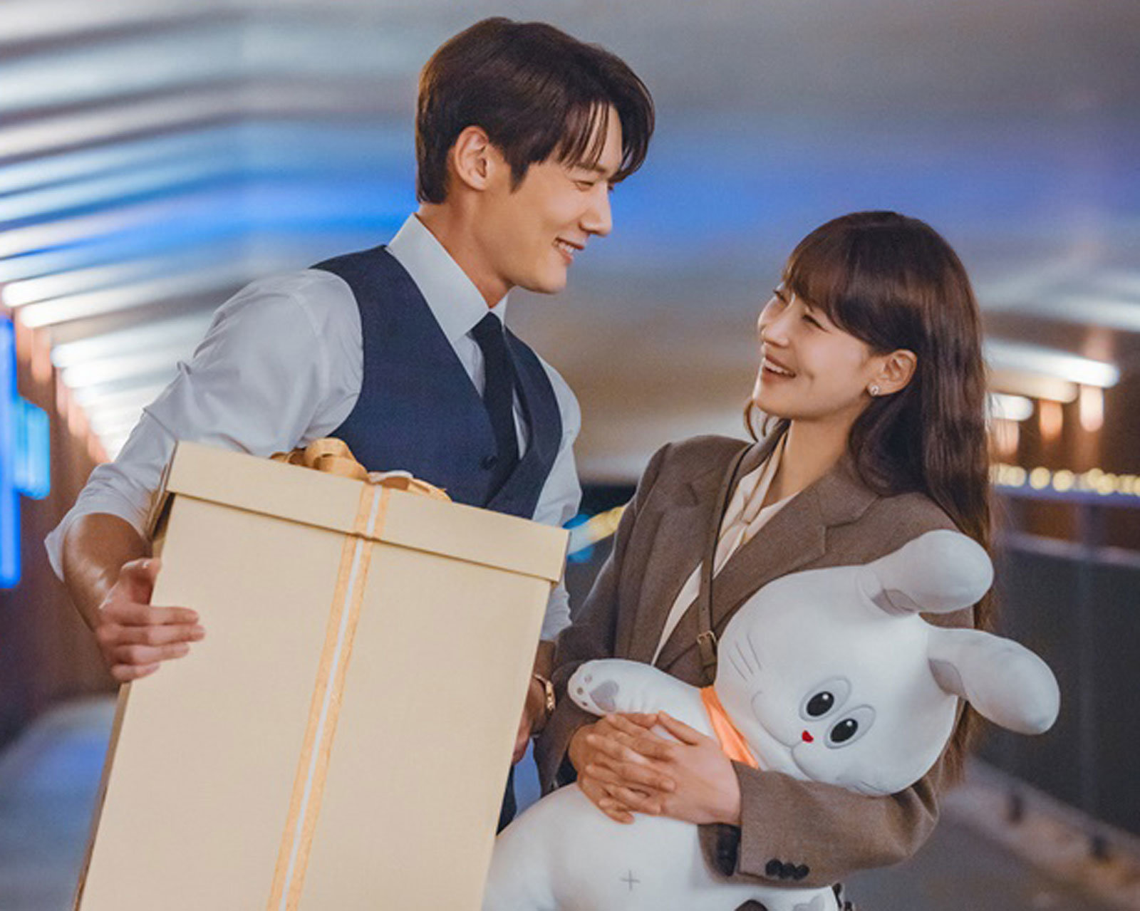 두 사람은 각각 커다란 상자와 토끼 인형을 품에 안고 있어 무슨 일이 있었는지 전 상황에 대한 궁금증을 유발한다. 특히 설렘이 묻어나는 눈웃음과 입가에 살며시 번진 미소는 서로만 보인다는 듯 로맨틱 텐션으로 시선을 사로잡는다.