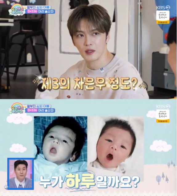 김재중은 하루를 바라보며 “형수님이 BTS 정국 닮았는데 하루 얼굴에는 형이랑 형수님 얼굴이 다 섞여 있다. 너무 잘생기고 예쁘다. 어느 쪽으로 표현해야 할지 모르겠다. 잘생쁨이다”라고 극찬했다. 이어 “제3의 차은우 정도 되지 않겠냐”고 덧붙였다.