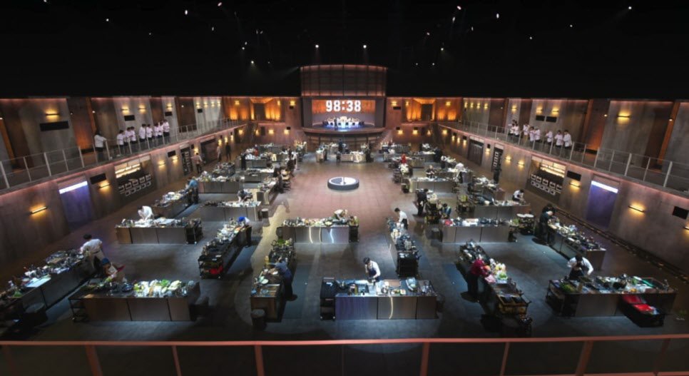 ‘흑백요리사’의 상징은 단연 100명이 경쟁하는 대형 주방이다. 특히 흑수저 셰프 80명이 한 공간에서 동시에 불을 올리는 장면은 “예능이 아니라 스포츠 경기 같다”라는 말을 만들어냈다. 일반적인 요리 프로그램 세트를 넘어, 대규모 조리 공간이 그대로 전장처럼 펼쳐지면서 강한 인상을 남겼다는 반응이 이어진다.