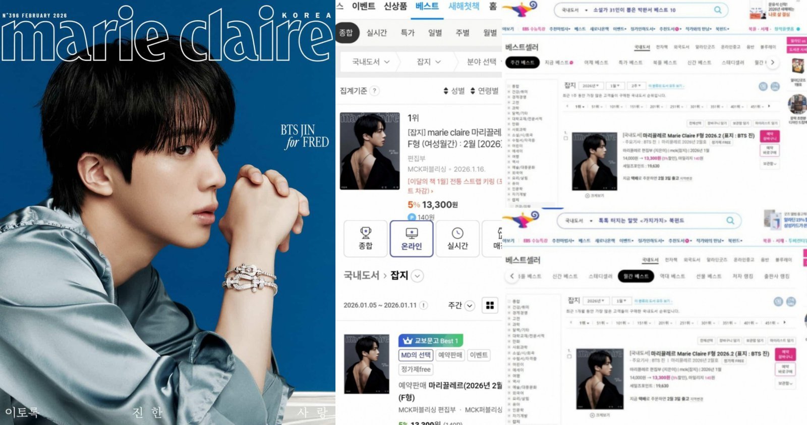 해외에서도 비슷한 장면이 연출됐다. 일본 패션 잡지 SPUR는 오랜 기간 러브콜 끝에 진을 2026년 1월호 표지 모델로 선정했다. SPUR 1월호는 예약 판매와 동시에 아마존 재팬 베스트셀러 1위를 기록했고, 교보문고에서도 품절되며 일본 시장에서도 진의 영향력을 확인시켰다.