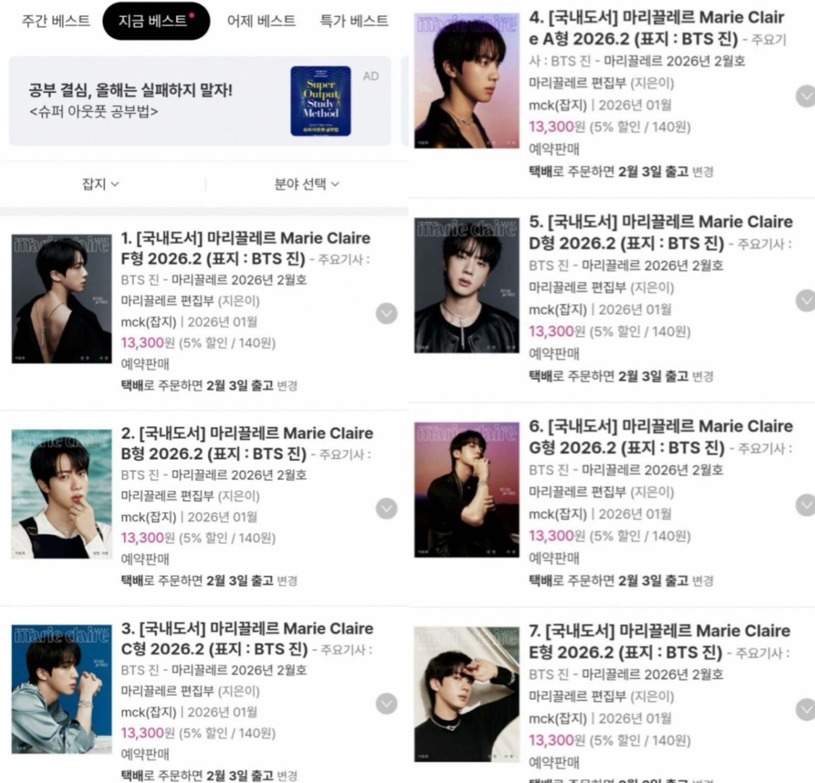 방탄소년단(BTS) 진이 표지 모델로 나선 마리끌레르 2월호가 예약 판매 단계부터 기록을 쏟아냈다. 마리끌레르 2월호는 알라딘에서 공개된 7종 전 버전이 잡지 베스트셀러 1위부터 7위까지 나란히 이름을 올리며 압도적인 반응을 끌어냈다. 단기간에 전권이 상위권을 점령한 사례는 이례적이라는 평가다.
