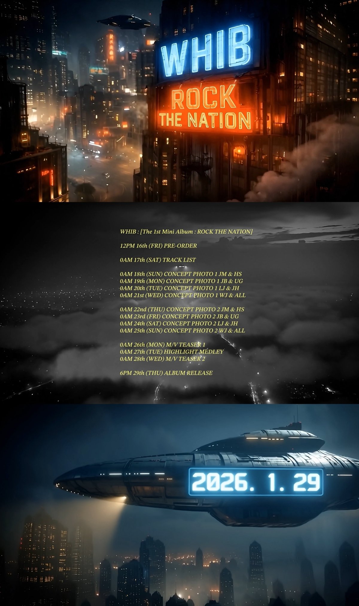 공개된 스케줄러 영상에는 거대한 빌딩 위에 팀명 WHIB와 앨범명 ‘ROCK THE NATION’이 블루와 레드 컬러의 네온사인으로 구현돼 강렬한 인상을 남긴다. 여기에 미스터리한 비행체가 상공을 가로지르며 스케일감 있는 SF 무드를 더해, 휘브 특유의 세계관에 대한 궁금증을 높였다.