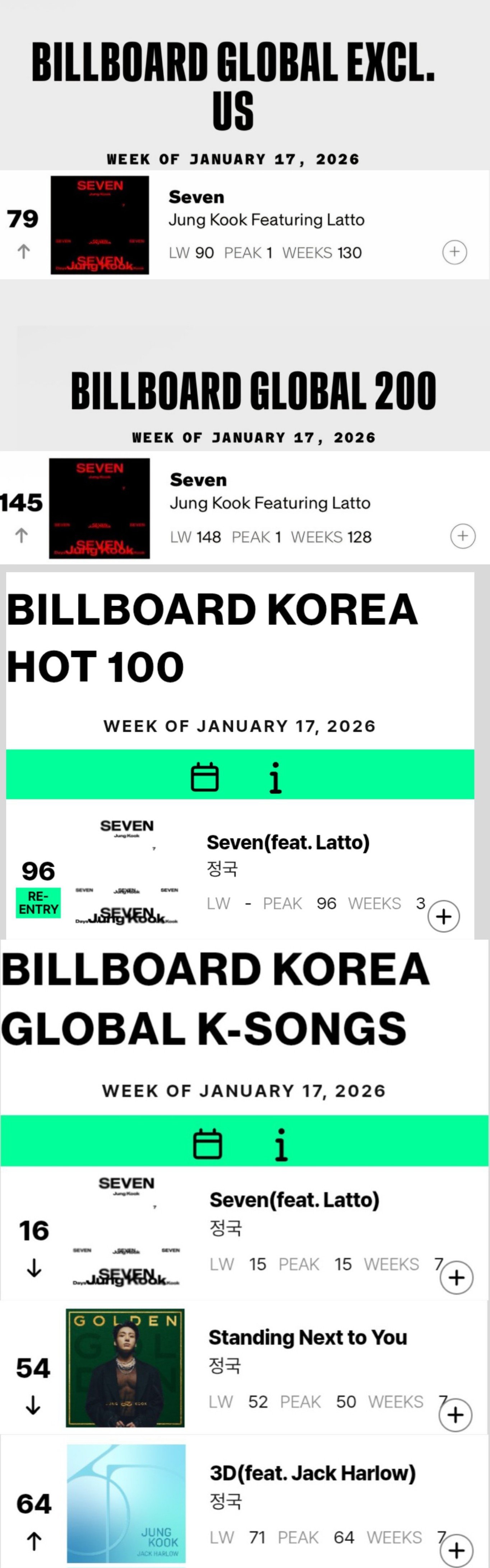 국내외 차트에서도 강세는 이어졌다. 빌보드 코리아 ‘핫 100’ 차트에 ‘Seven’은 96위로 재진입했고, 빌보드 ‘글로벌 K-송즈’ 차트에는 ‘Seven’ 16위, ‘Standing Next To You’ 54위, ‘3D’ 64위로 정국의 솔로곡 세 곡이 동시에 이름을 올렸다.