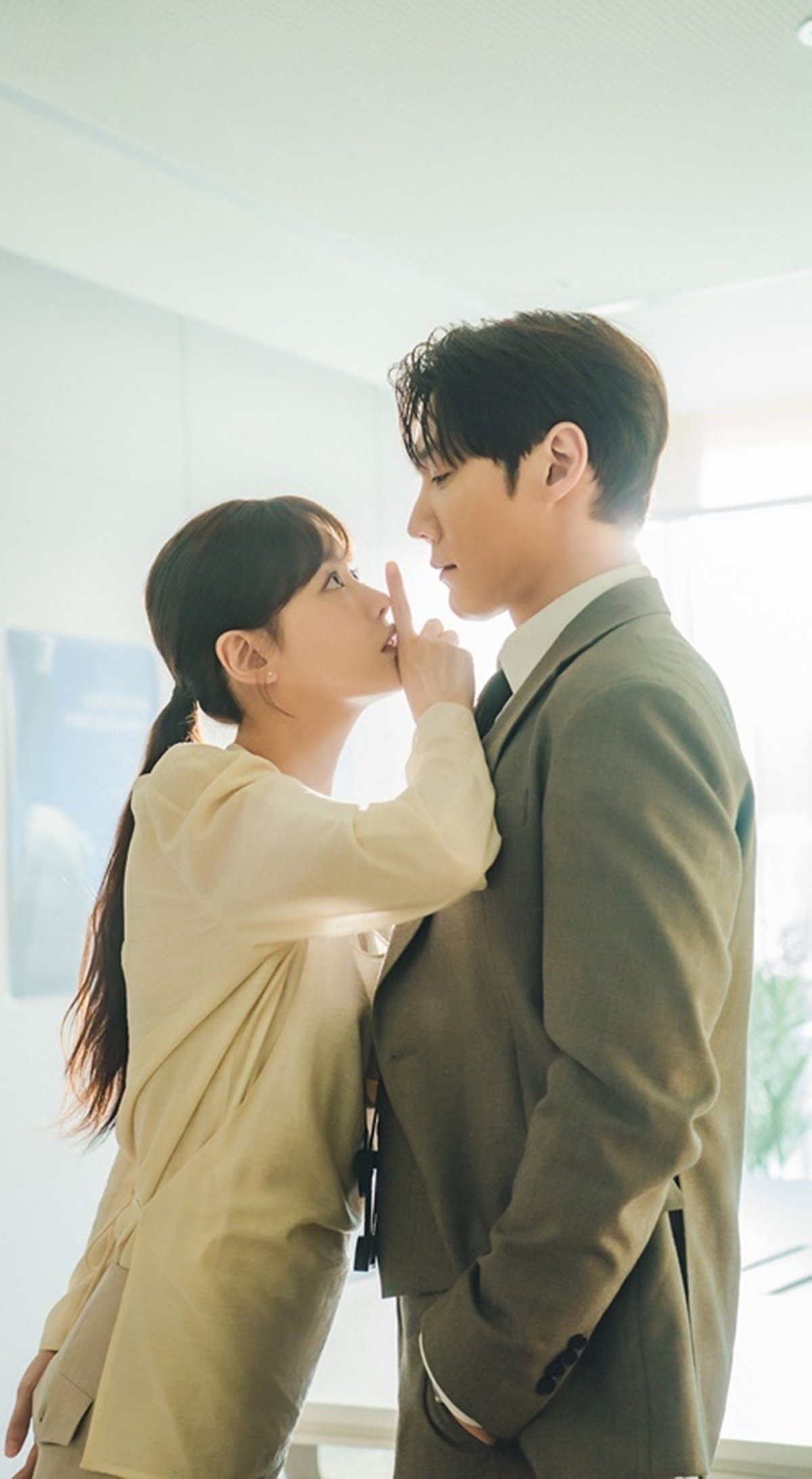 공개된 스틸 속 두준과 희원은 단둘이 아무도 없는 빈 회의실에서 숨을 죽이고 있다. 희원은 새어 나오는 숨소리마저 들키면 안 된다는 듯 검지를 입에 대고 ‘쉿’ 제스처를 취하고 있고, 그런 희원을 바라보는 두준의 눈빛이 핑크빛 긴장감을 자아낸다.