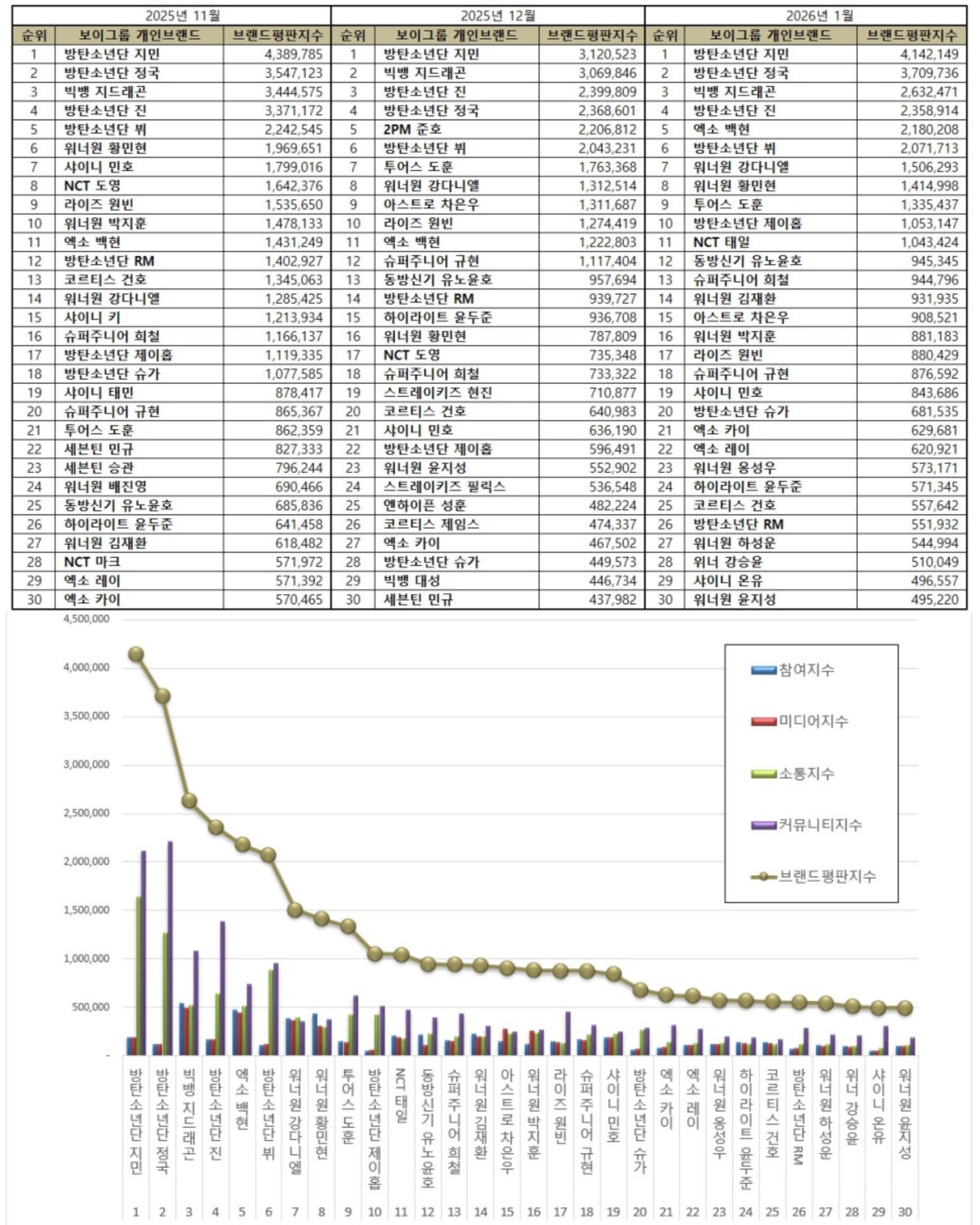 이번 조사에서 지민 브랜드는 참여지수 19만1119, 미디어지수 19만3580, 소통지수 164만4486, 커뮤니티지수 211만2964로 집계됐다. 이를 합산한 브랜드평판지수는 414만2149로, 12월 기록한 312만523과 비교해 32.74% 상승했다. 수치 전반에서 고른 상승세를 보이며 1위 자리를 굳혔다.