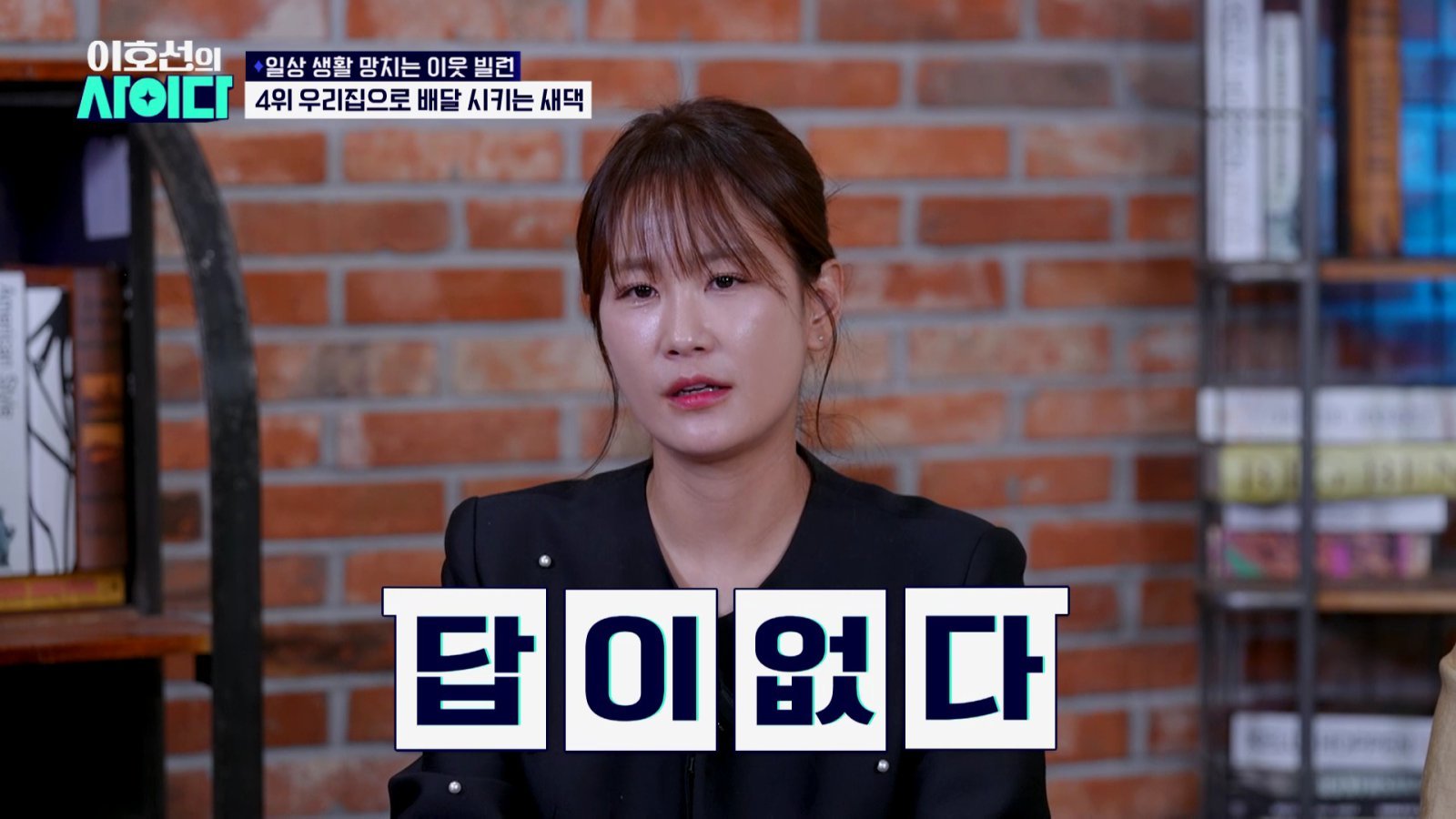 3위는 ‘복도가 자기들 집인 줄 아는 옆집’이었다. 복도식 아파트에 사는 사연자는 옆집이 문을 늘 활짝 열어두고 복도에 재활용품, 박스, 화분, 심지어 음식물 쓰레기통까지 내놓아 악취와 불편이 커졌다고 호소했다. 복도에서 담배를 피우는 것은 물론, 아이와 반려견이 복도를 뛰어다니며 소음이 발생해 항의했지만 “공용 공간이 우리 집 앞이면 우리 공간”이라는 적반하장 반응만 돌아왔다는 것. 이호선은 “이 집은 답이 없다”라며 “소방법에 걸리는 사안”이라는 말과 함께 관리사무소 및 기관과의 협조를 강조했다.