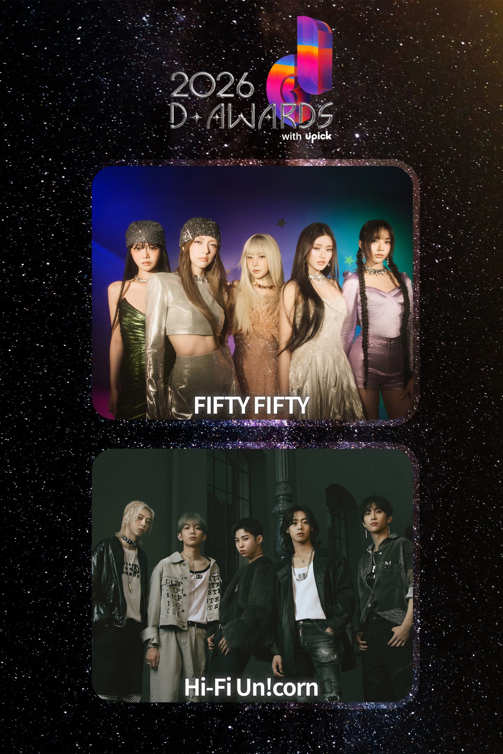 푸키’ 신드롬의 주역 피프티피프티(위)와 케이(K)오디션이 낳은 한일 합작 밴드 하이파이유니콘이 제2회 디 어워즈 4차 라인업에 이름을 올렸다. 사진제공|어트랙트·FNC엔터테인먼트