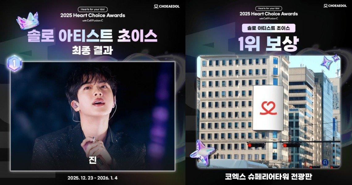 방탄소년단(BTS) 진이 글로벌 팬들의 선택을 한몸에 받았다. 진은 ‘2025 하트 초이스 어워즈’ 솔로 아티스트 초이스 부문에서 총 1295점을 기록하며 최종 1위에 올랐다. 이번 어워즈는 최애돌 앱과 셀퓨전씨가 함께 진행했으며, 2025년 12월 23일부터 2026년 1월 4일까지 팬 투표 100퍼센트로 수상자가 결정됐다. 수치로 남은 결과지만, 그 이면에는 전 세계 아미의 응집된 참여가 있었다는 점에서 의미가 크다.