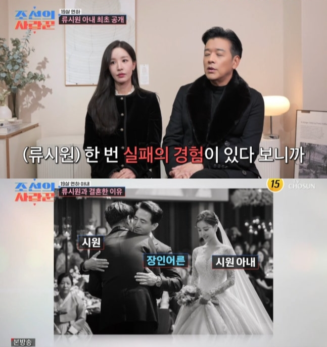 19일 밤 10시 방송된 TV조선 예능프로그램 ‘조선의 사랑꾼’에는 류시원(53)과 수학강사 아내 이아영(34)이 출연했다. 류시원은 절친 윤정수 부부와 식사를 위해 아내와 외출에 나섰고, 식사 자리에서 두 사람의 첫 만남부터 결혼 과정까지 솔직하게 풀어냈다.