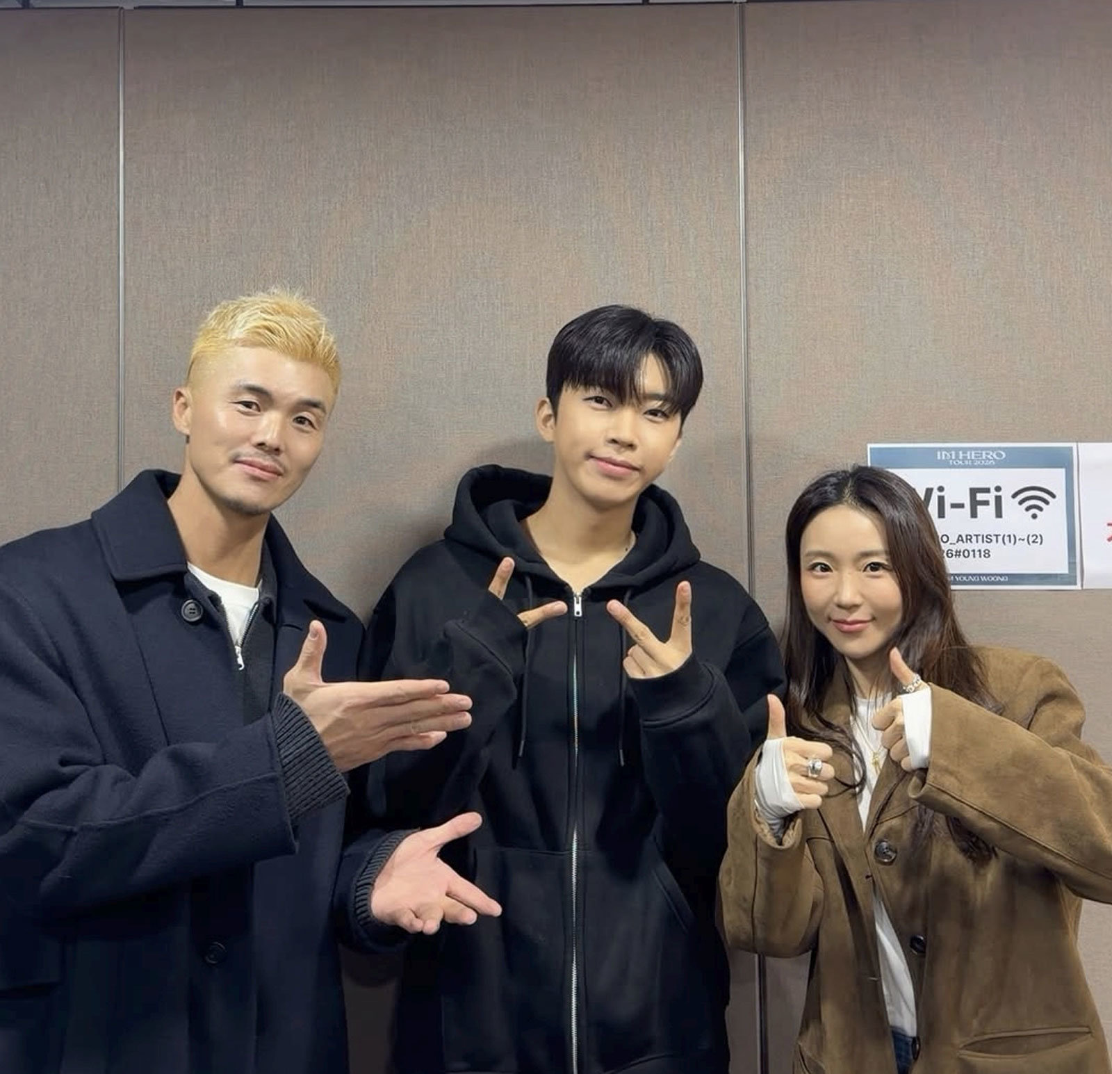 공개된 사진에는 임영웅과 김영광, 김은지 부부의 모습이 담겼다. 임영웅은 편안한 캐주얼 차림 속에서도 밝은 미소와 설렘 가득한 표정으로 브이 포즈를 취해 눈길을 끈다.