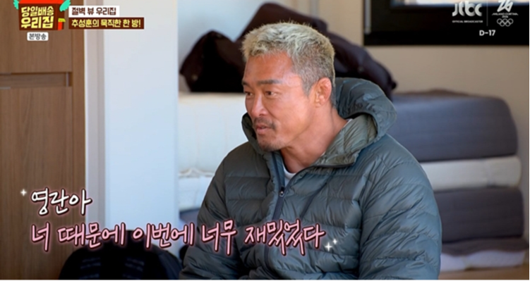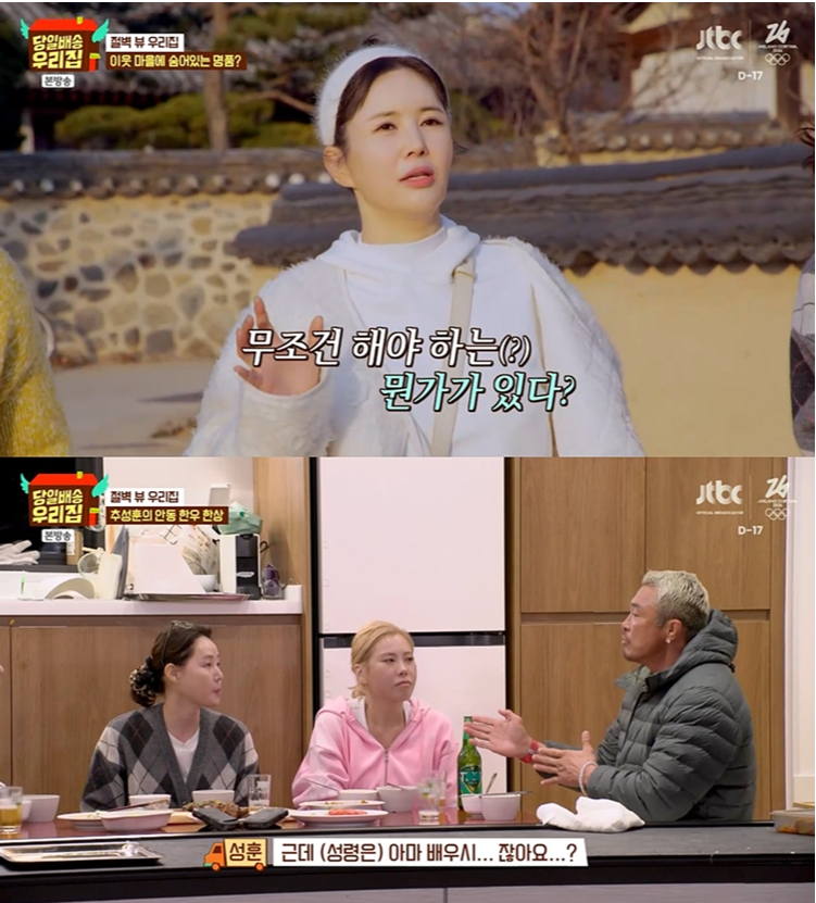 20일 방송된 JTBC ‘당일배송 우리집’에서는 첫 숙박 게스트 추성훈과 함께 김성령, 하지원, 장영란, 가비가 절벽 앞 로망 하우스에서 하루를 보냈다. 고즈넉한 풍경 속에서도 장영란과 추성훈의 ‘창과 방패’ 상극 케미가 쉴 새 없이 이어졌다.