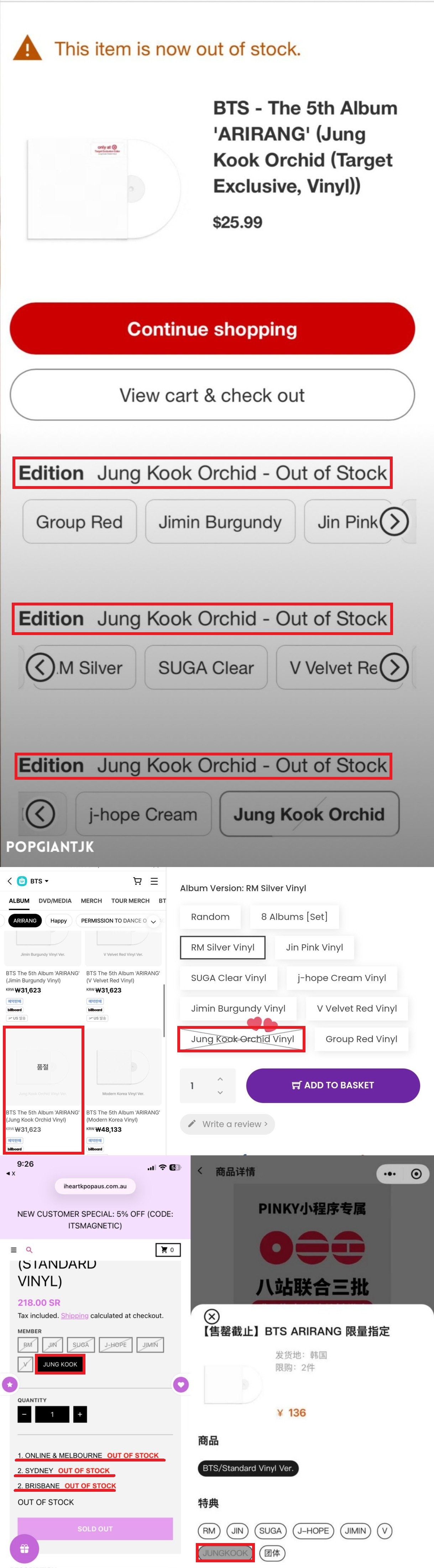 유럽 최대 규모의 K팝 전문 매장 ipurple과 호주 음반 판매점 iHeartPopAus에서도 정국의 오키드 LP는 멤버 최초 품절 사례로 기록됐다. 중국 전자상거래 플랫폼 PINKY에서 진행된 3차 예약 판매 역시 정국 버전이 가장 먼저 마감되며 높은 수요를 입증했다.