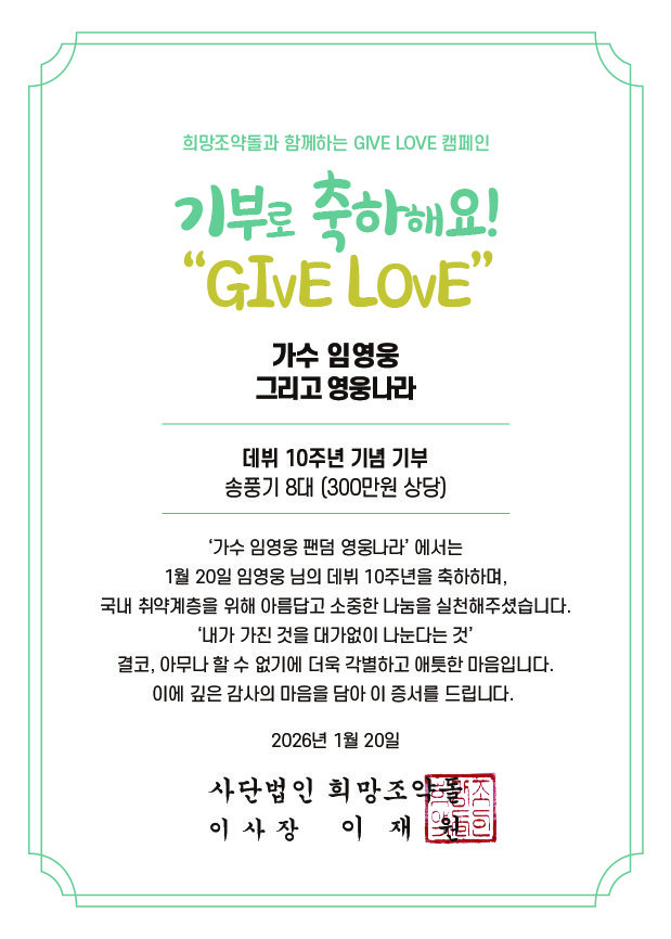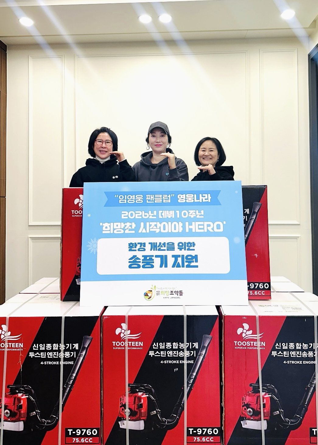 가수 임영웅 팬카페 영웅나라는 2026년 임영웅 데뷔 10주년을 맞는 해를 기념해 ‘희망찬 시작이야 HERO’라는 슬로건 아래 희망조약돌에 300만 원 상당의 물품을 기부했다. 데뷔 10주년을 향한 응원을 사회적 나눔으로 연결한 행보다.