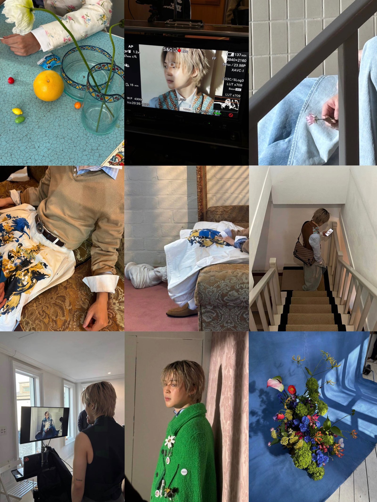 사진 속 지민은 금발 헤어스타일에 디올 특유의 세련된 스타일링을 더해 신비롭고 로맨틱한 분위기를 연출했다. 촬영 소품을 클로즈업한 장면부터 계단에 앉아 스마트폰을 바라보는 모습, 대기 시간의 여유로운 순간까지 이어지며 촬영 현장의 공기를 그대로 전했다. 정제된 포즈 없이도 화면을 채우는 존재감이 인상적이다.