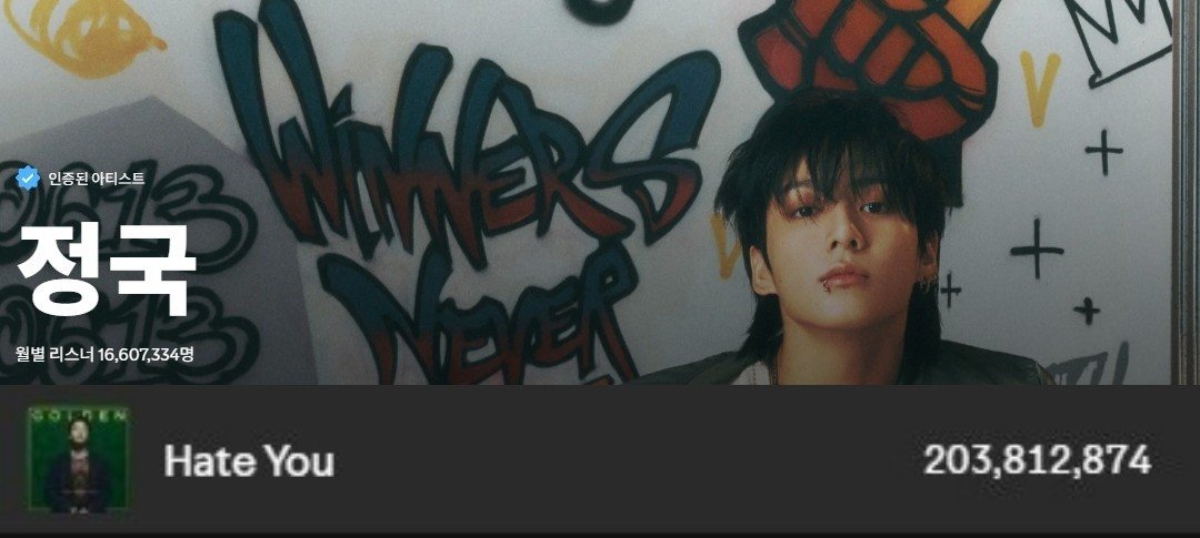 정국의 첫 솔로 앨범 GOLDEN의 수록곡 Hate You가 세계 최대 음원 스트리밍 플랫폼 스포티파이에서 2억 스트리밍을 돌파했다. 2023년 11월 공개된 이 곡은 별도의 공식 뮤직비디오가 없는 상황에서도 전 세계 리스너들의 꾸준한 선택을 받으며 이 같은 성과를 거뒀다.