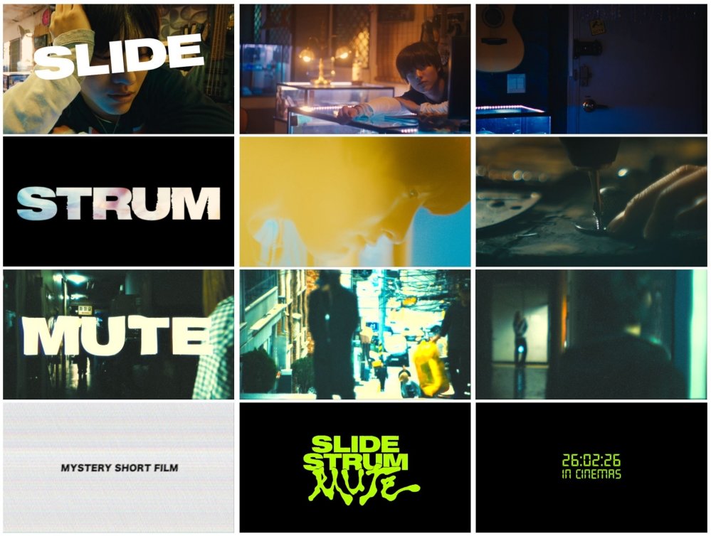 런칭 타이틀 클립 3종은 슬라이드, 스트럼, 뮤트라는 영화의 타이틀을 완성하는 단어들과 함께 ‘슬라이드 스트럼 뮤트’ 속 우진의 미스터리한 상황들이 질주하듯 전개돼 시선을 사로잡는다.