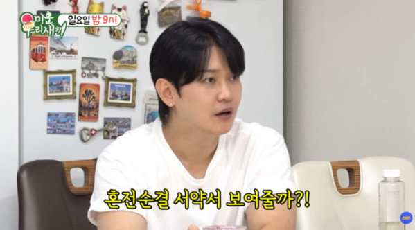 25일 밤 9시 5분 방송된 SBS ‘미운 우리 새끼’에는 강균성이 출연해 과거 화제가 됐던 ‘혼전순결’ 서약을 직접 꺼내 보였다. 이날 강균성을 찾아온 김희철이 “혼전순결을 아직도 지키고 있냐”고 묻자, 강균성은 “서약서 쓴 게 아직도 있다”며 서약서를 찾아왔다.