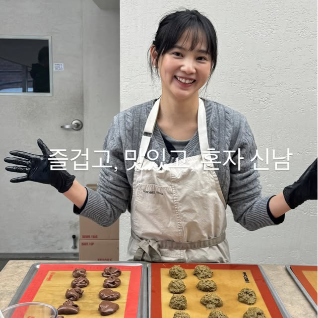 윤승아는 25일 자신의 SNS에 두바이 쫀득 쿠키, 이른바 두쫀쿠를 만드는 과정을 담은 사진 여러 장을 공개했다. 앞치마를 두르고 반죽을 빚는 모습부터 완성된 쿠키 앞에서 미소 짓는 장면까지 자연스러운 일상이 담겼다.