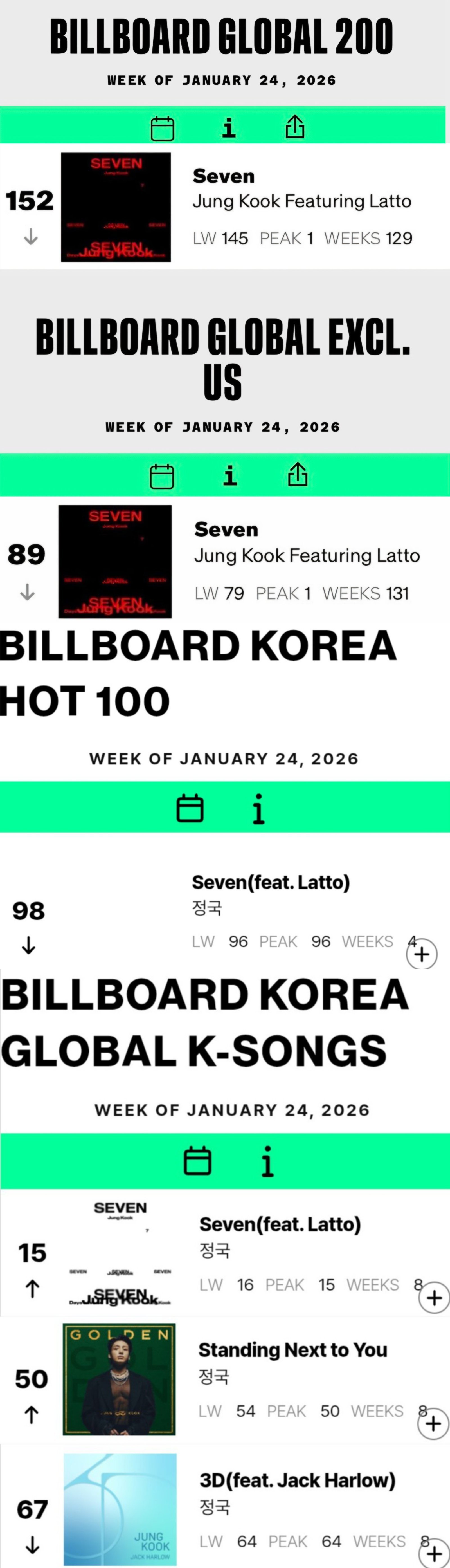 방탄소년단(BTS) 정국의 첫 솔로 데뷔곡 ‘Seven’이 미국 음악 전문 매체 빌보드가 발표한 1월 24일 자 ‘글로벌 200’ 차트에서 152위를 기록했다. 2023년 7월 발매된 이 곡은 해당 차트에 129주 동안 진입하며 아시아 그룹 및 솔로 가수곡 가운데 최초이자 최장 기록을 이어가고 있다.
