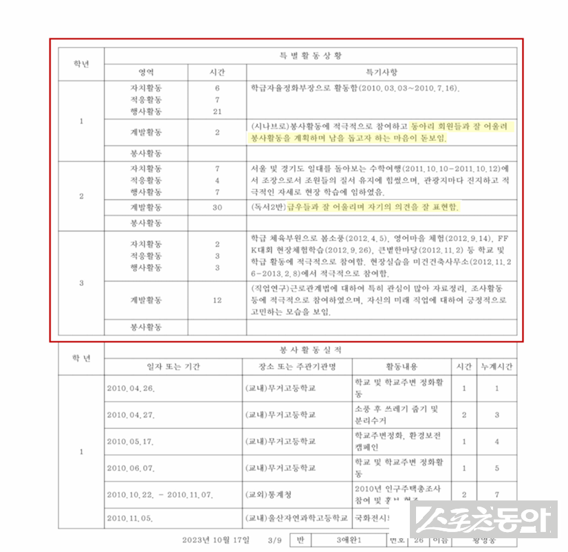 골든보이스는 이날 황영웅의 학창 시절 생활기록부 내용도 함께 공개했다. 소속사 설명에 따르면 황영웅은 학급자율정화부장으로 활동했고, 봉사활동에 적극 참여했다는 담당 교사 평이 담겼다. 수학여행 조장으로 조원들의 질서 유지에 힘썼다는 내용과 급우들과 잘 어울렸다는 기록도 포함됐다. 고등학교 시절 학교 및 학교 주변 정화활동 등 봉사활동에 참여했다는 설명도 덧붙였다.