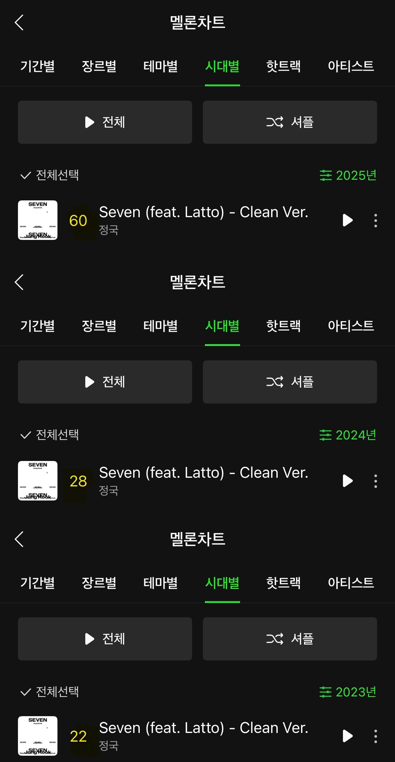 방탄소년단(BTS) 정국이 국내 최대 음원 플랫폼 멜론에서 꾸준한 존재감을 증명했다. 정국의 첫 솔로 데뷔곡 ‘Seven’은 멜론 연간 차트 60위에 오르며 3년 연속 연간 차트 진입에 성공했다. 2023년 7월 공개된 이후 해마다 연간 차트에 포함되며 장기간 사랑받는 곡으로 자리 잡았다.