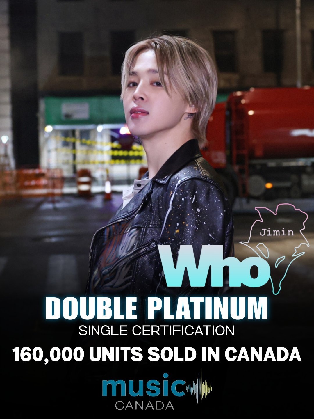 방탄소년단(BTS) 지민의 솔로 행보가 캐나다에서 또 하나의 기록을 추가했다. 지민의 솔로곡 ‘Who’는 1월 19일 뮤직 캐나다에서 더블 플래티넘 싱글 인증을 획득했다. 캐나다 음악 산업을 대표하는 뮤직 캐나다는 디지털 다운로드, 스트리밍 횟수, 실물 싱글 판매량을 합산해 인증을 부여하며, 싱글 기준 골드 4만, 플래티넘 8만, 더블 플래티넘 16만 유닛 이상 판매를 기준으로 삼는다.