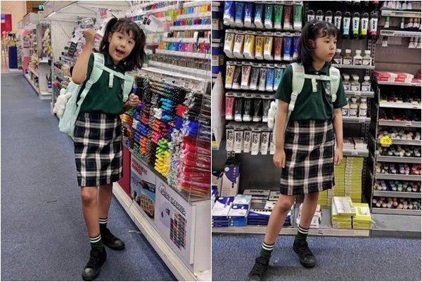 진열대 앞에 선 로아는 단정한 스쿨룩 스타일로 눈길을 끌었고, 또래보다 훌쩍 자란 키와 가늘고 쭉 뻗은 다리 라인이 시선을 모았다.