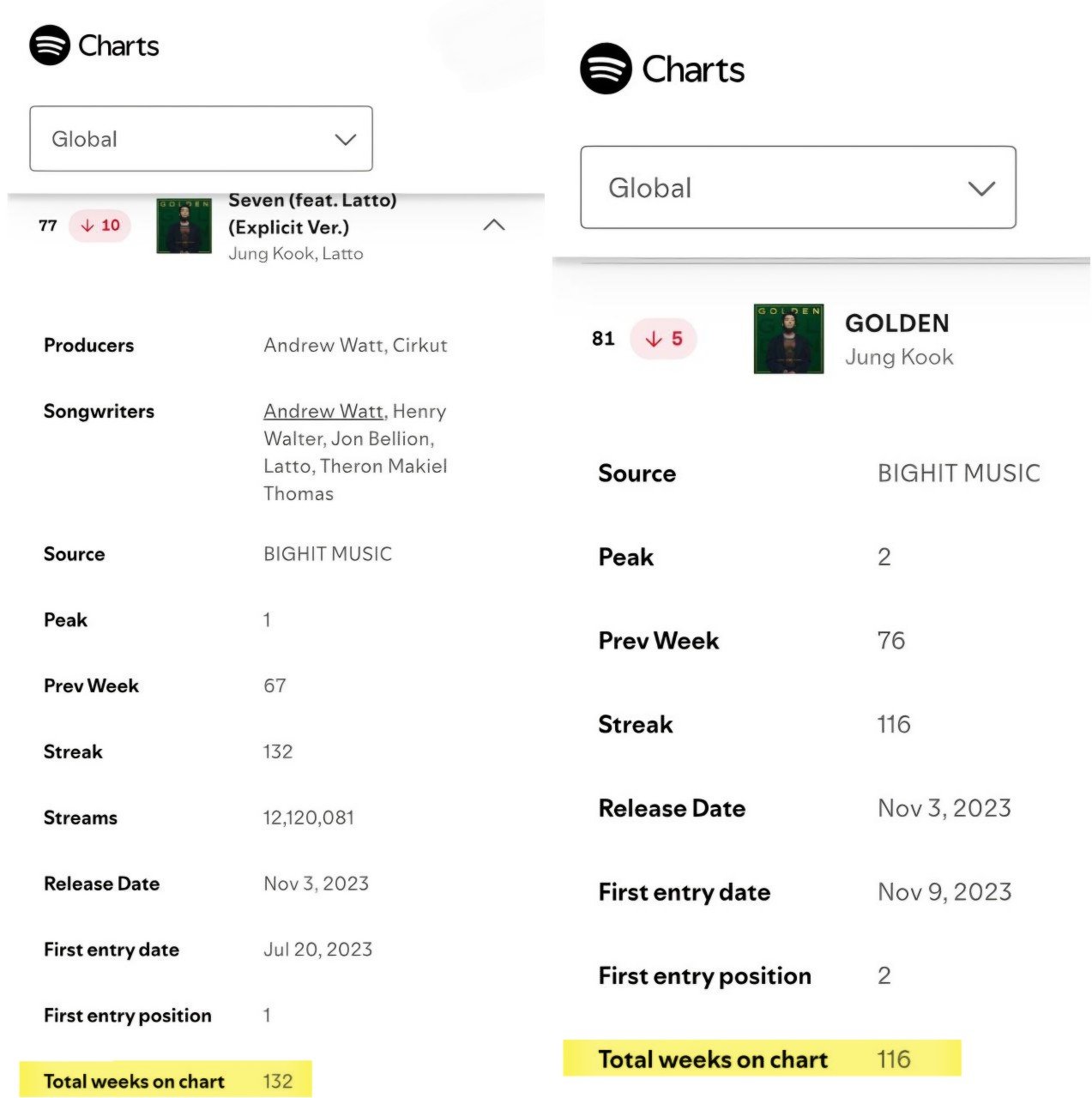 정국의 첫 솔로 정규 앨범 ‘GOLDEN’ 역시 꾸준한 성적을 이어가고 있다. 같은 기간 스포티파이 ‘위클리 톱 앨범 글로벌’ 차트에서 81위를 기록했으며, 해당 차트에 역대 아시아 솔로 가수 음반 최초이자 최장 기간인 116주 연속 진입에 성공했다. ‘GOLDEN’은 스포티파이에서 아시아 가수 정규 앨범 가운데 최다 누적 스트리밍 수치인 66억 회를 돌파하며 음반 단위에서도 압도적인 기록을 남기고 있다.