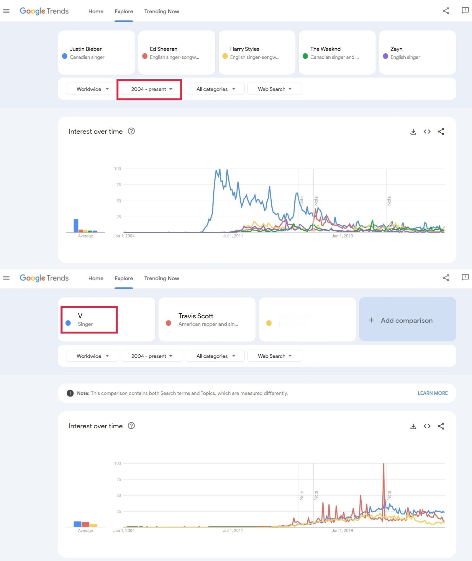 1990년대 이후 출생한 남자 팝스타 가운데 최다 검색 1위는 저스틴 비버였으며, 에드 시런, 해리 스타일스, 위켄드, 원 디렉션 출신 제인 말리크, 뷔, 트래비스 스콧이 뒤를 이었다.