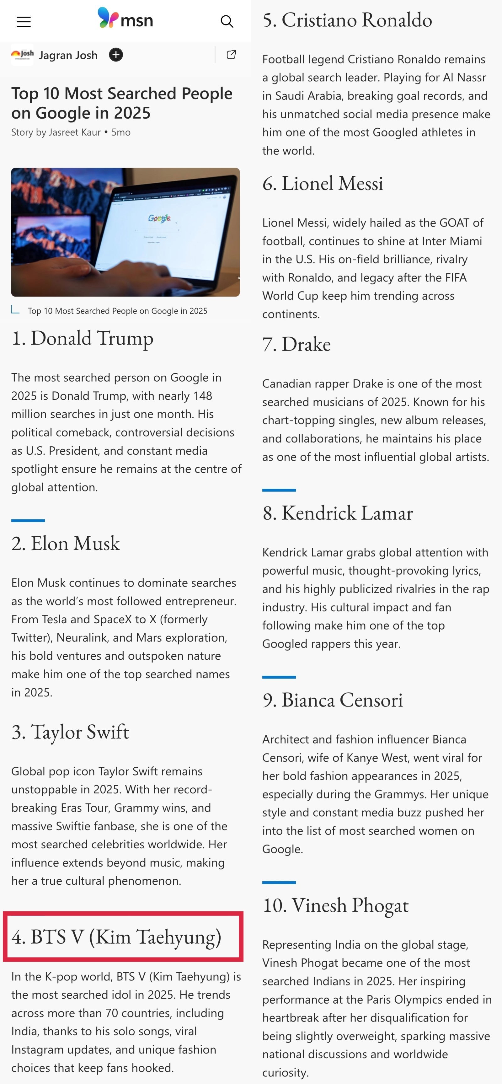 방탄소년단(BTS) 뷔가 2025년 전 세계에서 ‘구글에서 최다 검색된 인물 톱 10’ 가운데 4위를 기록했다. msn에 게재된 보도에 따르면, 뷔는 원스톱 리소스 플랫폼 Jagran Josh가 발표한 ‘2025년 구글에서 최다 언급된 인물 톱 10’ 순위에서 도널드 트럼프, 일론 머스크, 테일러 스위프트에 이어 네 번째로 높은 관심도를 보였다. 정치, 경제, 스포츠, 음악계를 대표하는 인물들이 포진한 순위에서 K팝 아티스트로 상위권에 오른 사례다.