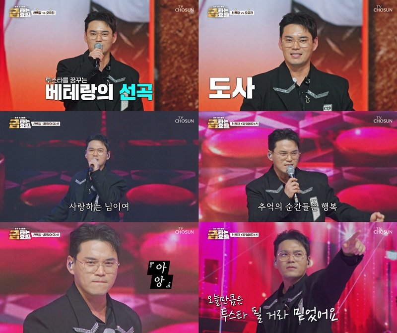 천록담은 지난 30일 방송된 TV조선 ‘금타는 금요일’에 출연해 오유진과 트로트 데스매치를 펼쳤다. 이날 골든 스타로는 ‘아파트’의 원곡자이자 원조 국민가수 윤수일이 등장해 무대의 무게감을 더했다.