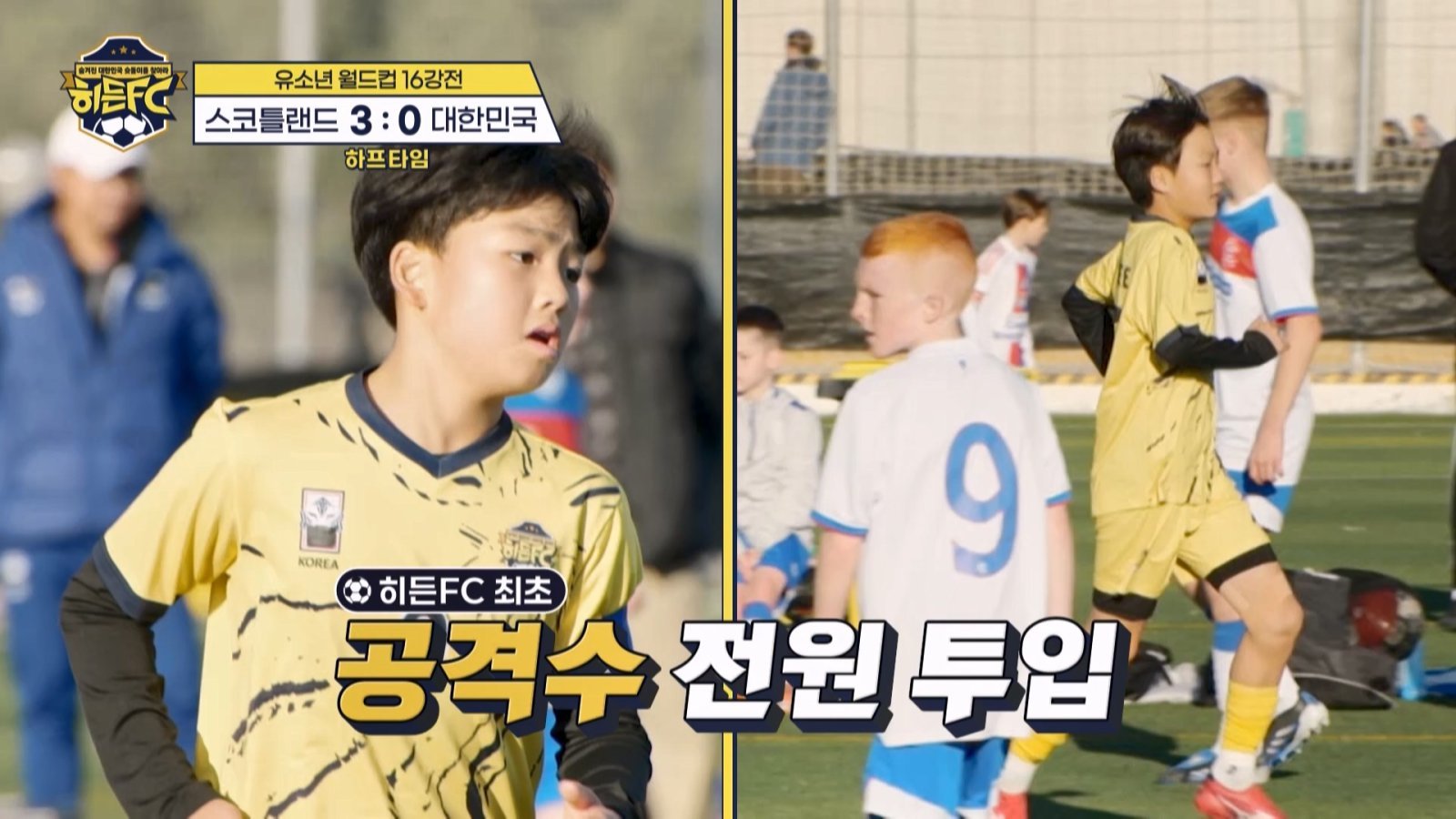경기 초반부터 스코틀랜드의 거센 공격이 이어졌고, 전반 3분 만에 선제골을 내주며 흐름이 기울었다. 피지컬과 조직력에서 밀린 ‘히든FC’는 전반을 0:3으로 마쳤다. 김성주는 “다윗과 골리앗 같다”며 선수들의 고군분투를 전했다.