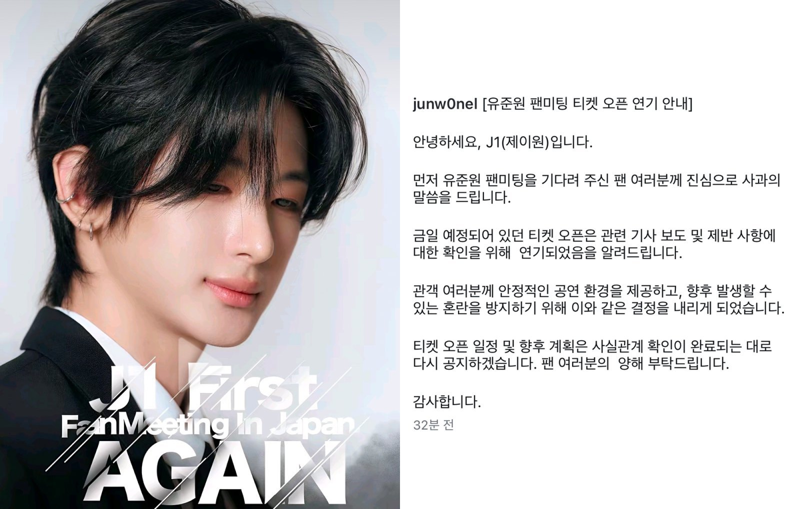 [스포츠동아 이정연 기자] 유준원이 전속계약 위반 분쟁 속 일본 팬미팅 티켓 오픈을 연기하며 또다시 일정에 제동이 걸렸다.