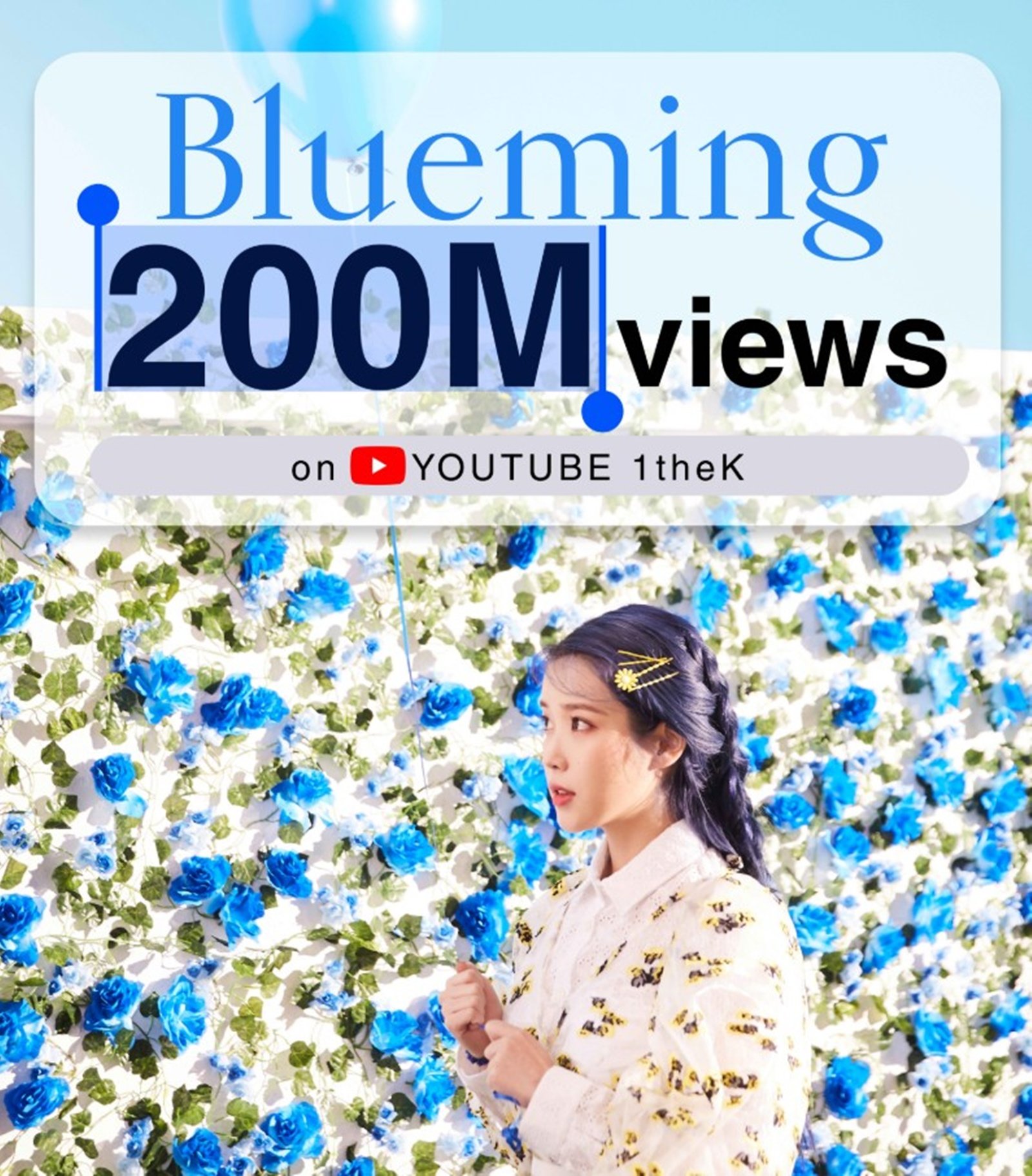 소속사 EDAM엔터테인먼트에 따르면, 아이유의 ‘Blueming’ 뮤직비디오는 1일 오후 7시 8분께 유튜브 조회수 2억 뷰를 돌파했다. 아이유 통산 세 번째 2억 뷰 뮤직비디오다.